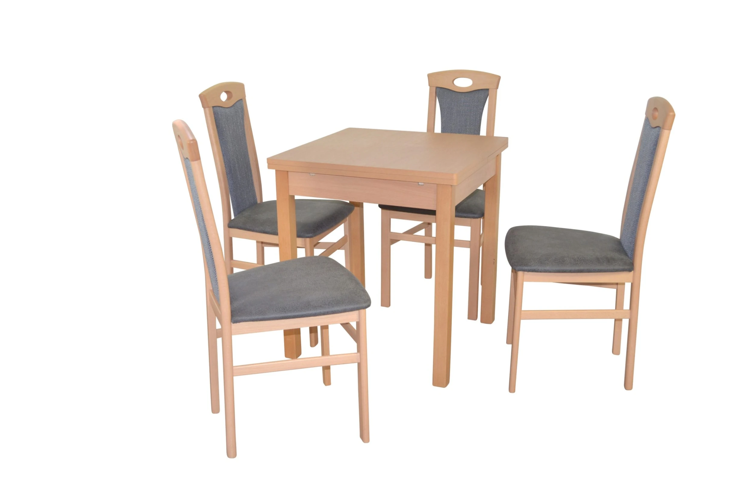 Hochwertige 5tlg. Essgruppe bestehend aus 4 Massivholzstühlen und 1 Esstisch mit zwei Ansteckplatten zum Vergrößern. Stühle aus Massivholz Buche, buchefarben gebeizt und lackiert. Sitz und Rücken sind bequem schaumstoffgepolstert und mit attraktiven Stoffbezügen bezogen. Sitz mit einem Bezug in Kunstlederoptik (100% Polyester), Rücken mit einem Strukturstoffbezug (90% Polyester/10% Rayon). Praktisch die eingearbeitete Griffmuschel im oberen Rückenbereich. Esstisch mit zwei Ansteckplatten (je ca. 30 cm breit), die rechts/links unter der Tischplatte eingeschogen sind, dadurch lässt sich die Tischplatte einfach und schnell von 67 cm bis auf 127 cm vergrößern. Beine vom Esstisch aus Massivholz Buche, buchefarben gebeizt und lackiert. Platten aus Holzwerkstoff die mit einem pflegeleichten Melamin-Holzdekor, Buche-Nachbildung, beschichtet sind. Die Stühle werden montiert angeliefert, der Esstisch flach verpackt zur Selbstmontage, inklusive Aufbauanleitung. Maße ca. cm je Stuhl: (B/H/T) 45/95/48. Sitzhöhe ca. 46 cm, Sitztiefe ca. 39 cm. Maße ca. cm Esstisch: (B/H/T) 67-127/75/67.