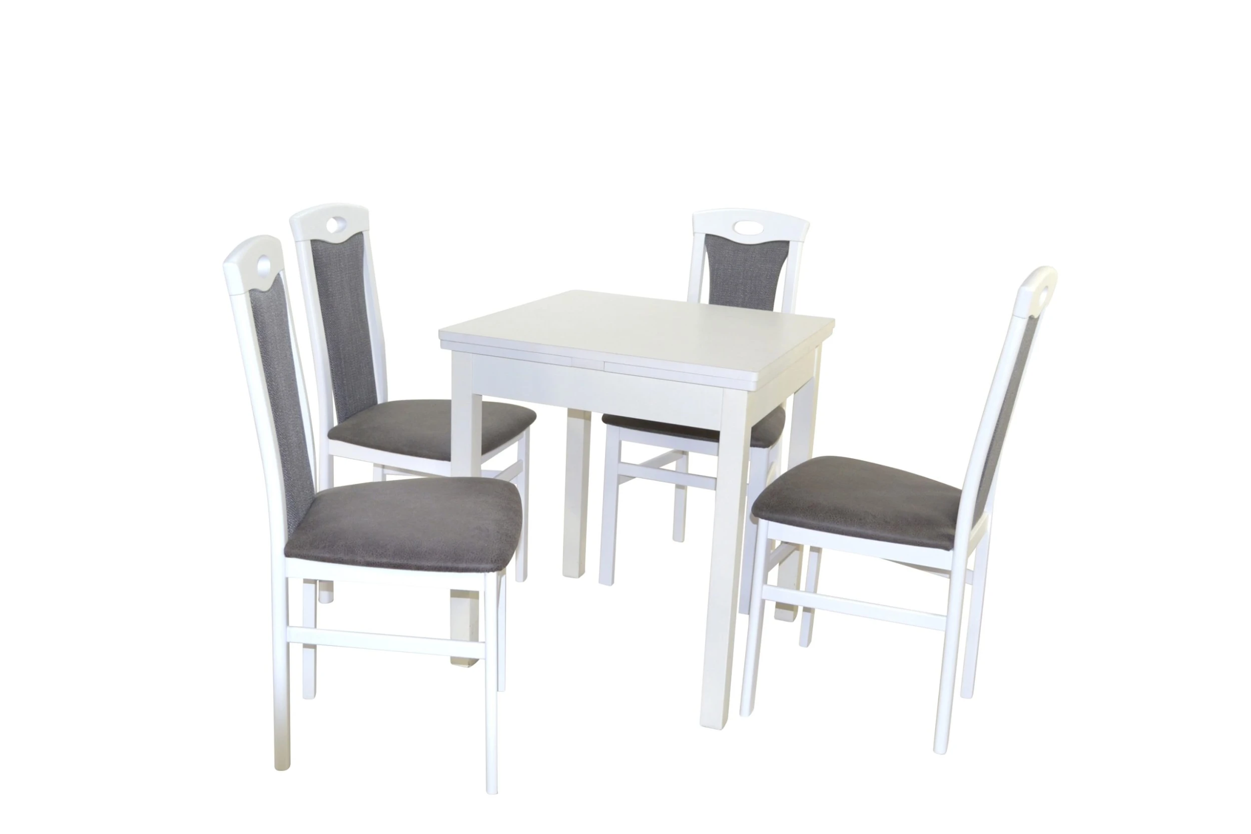Hochwertige 5tlg. Essgruppe bestehend aus 4 Massivholzstühlen und 1 Esstisch mit zwei Ansteckplatten zum Vergrößern. Stühle aus Massivholz Buche, weiß lackiert. Sitz und Rücken sind bequem schaumstoffgepolstert und mit attraktiven Stoffbezügen bezogen. Sitz mit einem Bezug in Kunstlederoptik (100% Polyester), Rücken mit einem Strukturstoffbezug (90% Polyester/10% Rayon). Praktisch die eingearbeitete Griffmuschel im oberen Rückenbereich. Esstisch mit zwei Ansteckplatten (je ca. 30 cm breit), die rechts/links unter der Tischplatte eingeschogen sind, dadurch lässt sich die Tischplatte einfach und schnell von 67 cm bis auf 127 cm vergrößern. Beine vom Esstisch aus Massivholz Buche, weiß lackiert. Platten aus Holzwerkstoff die mit einem pflegeleichten Melamin-Holzdekor, weiß, beschichtet sind. Die Stühle werden montiert angeliefert, der Esstisch flach verpackt zur Selbstmontage, inklusive Aufbauanleitung. Maße ca. cm je Stuhl: (B/H/T) 45/95/48. Sitzhöhe ca. 46 cm, Sitztiefe ca. 39 cm. Maße ca. cm Esstisch: (B/H/T) 67-127/75/67.