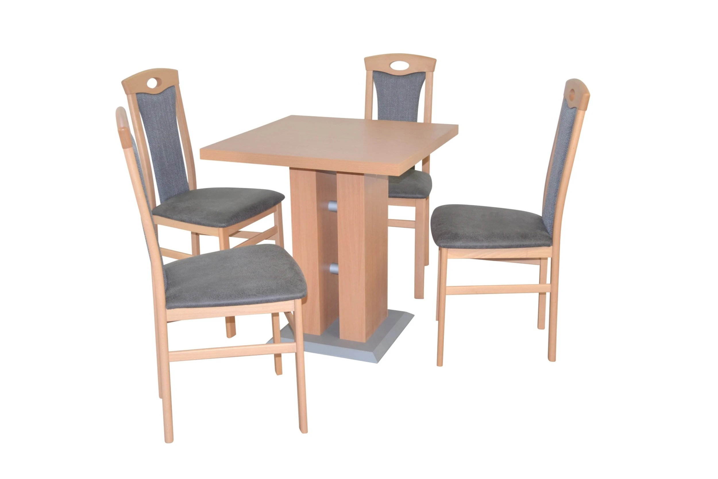 Hochwertige 5tlg. Essgruppe bestehend aus 4 Massivholzstühlen und 1 Esstisch. Stühle aus Massivholz Buche, buchefarben gebeizt und lackiert. Sitz und Rücken sind bequem schaumstoffgepolstert und mit attraktiven Stoffbezügen bezogen. Sitz mit einem Bezug in Kunstlederoptik (100% Polyester), Rücken mit einem Strukturstoffbezug (90% Polyester/10% Rayon). Praktisch die eingearbeitete Griffmuschel im oberen Rückenbereich. Esstisch mit einem modernen Säulengestell komplett aus Holzwerkstoff gefertigt und mit einem strapazierfähigen, pflegeleichten Melamin-Holzdekor, Buche-Nachbildung, beschichtet. Bodenplatte grau beschichtet, zusätzlich 2 silberfarbene Rohre im Säulengestell kombiniert. Die Stühle werden montiert angeliefert, der Esstisch flach verpackt zur Selbstmontage, inklusive Aufbauanleitung. Maße ca. cm je Stuhl: (B/H/T) 45/95/48. Sitzhöhe ca. 46 cm, Sitztiefe ca. 39 cm. Maße ca. cm Esstisch: (B/H/T) 70/75/70.