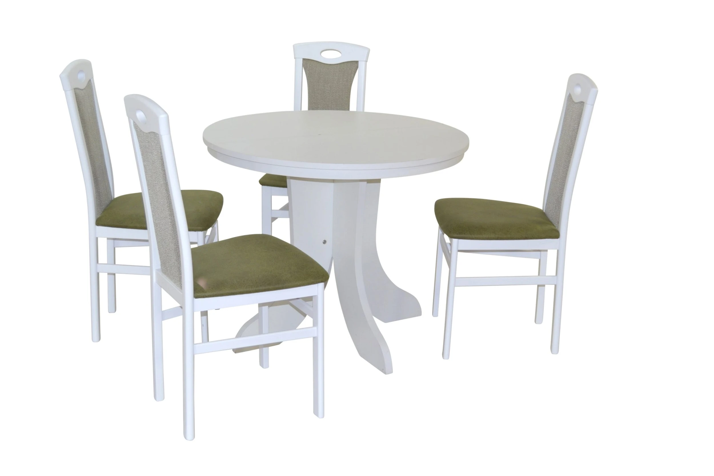 Hochwertige 5tlg. Essgruppe bestehend aus 4 Massivholzstühlen und 1 Esstisch. Stühle aus Massivholz Buche, weiß lackiert. Sitz und Rücken sind bequem schaumstoffgepolstert und mit attraktiven Stoffbezügen bezogen. Sitz mit einem Bezug in Kunstlederoptik (100% Polyester), Rücken mit einem Strukturstoffbezug (90% Polyester/10% Rayon). Praktisch die eingearbeitete Griffmuschel im oberen Rückenbereich. Esstisch mit einem modernen, stabilen Gestell komplett aus Holzwerkstoff gefertigt und mit einem strapazierfähigen, pflegeleichten Melamin-Holzdekor, weiß, beschichtet. Die runde Tischplatte ist ausziehbar und lässt sich durch die mitgelieferte ca. 40 cm breite Einlegeplatte von 90 cm auf 130 cm vergrößern. Die Stühle werden montiert angeliefert, der Esstisch flach verpackt zur Selbstmontage, inklusive Aufbauanleitung. Maße ca. cm je Stuhl: (B/H/T) 45/95/48. Sitzhöhe ca. 46 cm, Sitztiefe ca. 39 cm. Maße ca. cm Esstisch: (ØxH) 90×75 cm bis auf 130 cm Breite vergrößerbar. Einlegeplatte lässt sich nicht unter der Tischplatte verstauen.