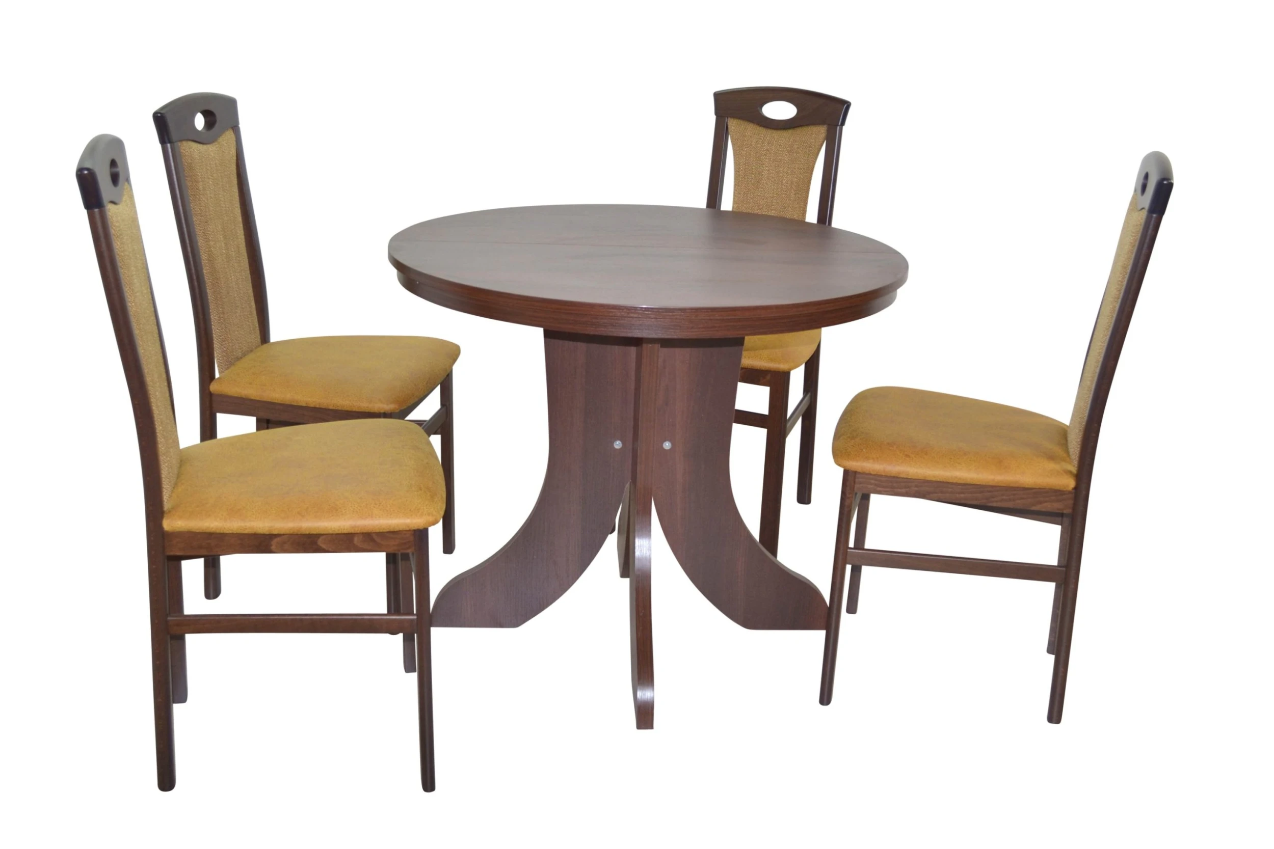 Hochwertige 5tlg. Essgruppe bestehend aus 4 Massivholzstühlen und 1 Esstisch. Stühle aus Massivholz Buche, nussbaumfarben gebeizt und lackiert. Sitz und Rücken sind bequem schaumstoffgepolstert und mit attraktiven Stoffbezügen bezogen. Sitz mit einem Bezug in Kunstlederoptik (100% Polyester), Rücken mit einem Strukturstoffbezug (90% Polyester/10% Rayon). Praktisch die eingearbeitete Griffmuschel im oberen Rückenbereich. Esstisch mit einem modernen, stabilen Gestell komplett aus Holzwerkstoff gefertigt und mit einem strapazierfähigen, pflegeleichten Melamin-Holzdekor, Nussbaum-Nachbildung, beschichtet. Die runde Tischplatte ist ausziehbar und lässt sich durch die mitgelieferte ca. 40 cm breite Einlegeplatte von 90 cm auf 130 cm vergrößern. Die Stühle werden montiert angeliefert, der Esstisch flach verpackt zur Selbstmontage, inklusive Aufbauanleitung. Maße ca. cm je Stuhl: (B/H/T) 45/95/48. Sitzhöhe ca. 46 cm, Sitztiefe ca. 39 cm. Maße ca. cm Esstisch: (ØxH) 90×75 cm bis auf 130 cm Breite vergrößerbar. Einlegeplatte lässt sich nicht unter der Tischplatte verstauen.