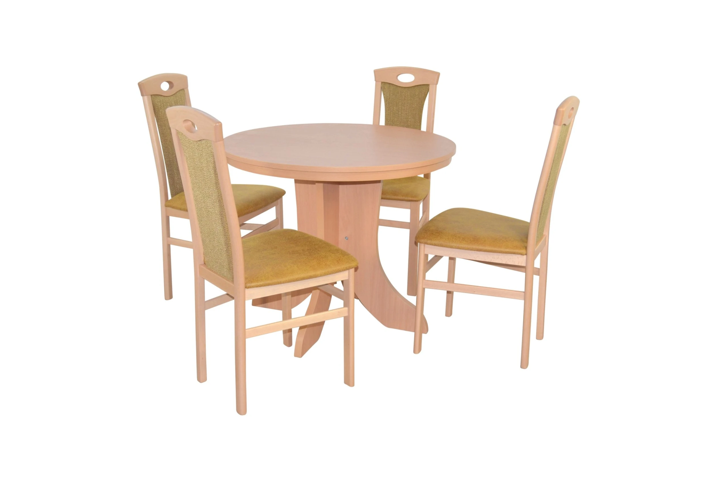 Hochwertige 5tlg. Essgruppe bestehend aus 4 Massivholzstühlen und 1 Esstisch. Stühle aus Massivholz Buche, buchefarben gebeizt und lackiert. Sitz und Rücken sind bequem schaumstoffgepolstert und mit attraktiven Stoffbezügen bezogen. Sitz mit einem Bezug in Kunstlederoptik (100% Polyester), Rücken mit einem Strukturstoffbezug (90% Polyester/10% Rayon). Praktisch die eingearbeitete Griffmuschel im oberen Rückenbereich. Esstisch mit einem modernen, stabilen Gestell komplett aus Holzwerkstoff gefertigt und mit einem strapazierfähigen, pflegeleichten Melamin-Holzdekor, Buche-Nachbildung, beschichtet. Die runde Tischplatte ist ausziehbar und lässt sich durch die mitgelieferte ca. 40 cm breite Einlegeplatte von 90 cm auf 130 cm vergrößern. Die Stühle werden montiert angeliefert, der Esstisch flach verpackt zur Selbstmontage, inklusive Aufbauanleitung. Maße ca. cm je Stuhl: (B/H/T) 45/95/48. Sitzhöhe ca. 46 cm, Sitztiefe ca. 39 cm. Maße ca. cm Esstisch: (ØxH) 90×75 cm bis auf 130 cm Breite vergrößerbar. Einlegeplatte lässt sich nicht unter der Tischplatte verstauen.