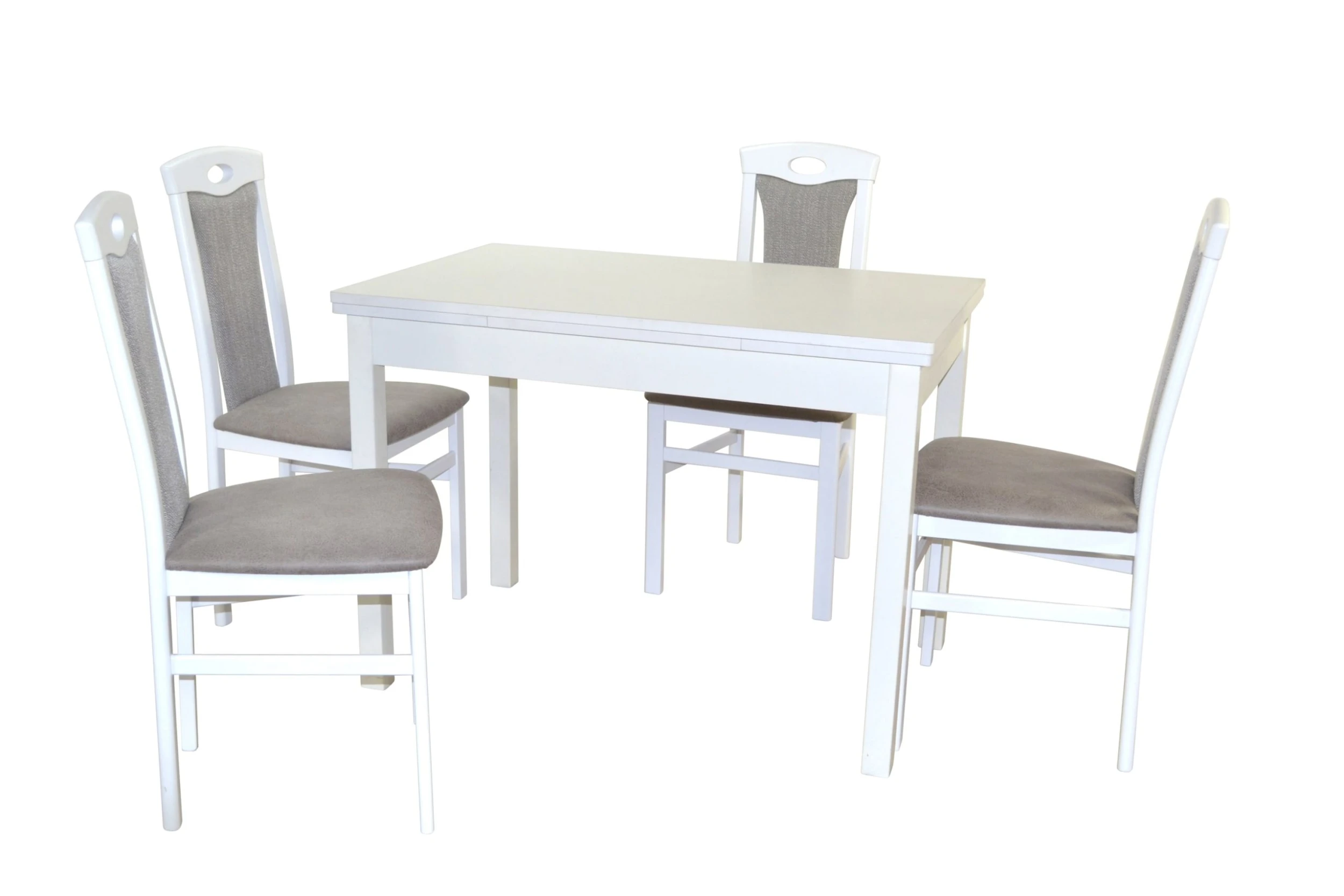 Hochwertige 5tlg. Essgruppe bestehend aus 4 Massivholzstühlen und 1 Esstisch mit zwei Ansteckplatten zum Vergrößern. Stühle aus Massivholz Buche, weiß lackiert. Sitz und Rücken sind bequem schaumstoffgepolstert und mit attraktiven Stoffbezügen bezogen. Sitz mit einem Bezug in Kunstlederoptik (100% Polyester), Rücken mit einem Strukturstoffbezug (90% Polyester/10% Rayon). Praktisch die eingearbeitete Griffmuschel im oberen Rückenbereich. Esstisch mit zwei Ansteckplatten (je ca. 30 cm breit), die rechts/links unter der Tischplatte eingeschogen sind, dadurch lässt sich die Tischplatte einfach und schnell von 104 cm bis auf 164 cm vergrößern. Beine vom Esstisch aus Massivholz Buche, weiß lackiert. Platten aus Holzwerkstoff die mit einem pflegeleichten Melamin-Holzdekor, weiß, beschichtet sind. Die Stühle werden montiert angeliefert, der Esstisch flach verpackt zur Selbstmontage, inklusive Aufbauanleitung. Maße ca. cm je Stuhl: (B/H/T) 45/95/48. Sitzhöhe ca. 46 cm, Sitztiefe ca. 39 cm. Maße ca. cm Esstisch: (B/H/T) 104-164/75/67.