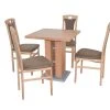 Hochwertige 5tlg. Essgruppe bestehend aus 4 Massivholzstühlen und 1 Esstisch mit zwei Ansteckplatten zum Vergrößern. Stühle aus Massivholz Buche, nussbaumfarben gebeizt und lackiert. Sitz und Rücken sind bequem schaumstoffgepolstert und mit attraktiven Stoffbezügen bezogen. Sitz mit einem Bezug in Kunstlederoptik (100% Polyester), Rücken mit einem Strukturstoffbezug (90% Polyester/10% Rayon). Praktisch die eingearbeitete Griffmuschel im oberen Rückenbereich. Esstisch mit zwei Ansteckplatten (je ca. 30 cm breit), die rechts/links unter der Tischplatte eingeschogen sind, dadurch lässt sich die Tischplatte einfach und schnell von 110 cm bis auf 170 cm vergrößern. Gestell vom Esstisch aus Massivholz Buche, nussbaumfarben gebeizt und lackiert. Platten aus Holzwerkstoff die mit einem pflegeleichten Melamin-Holzdekor, Nussbaum-Nachbildung, beschichtet sind. Die Stühle werden montiert angeliefert, der Esstisch flach verpackt zur Selbstmontage, inklusive Aufbauanleitung. Maße ca. cm je Stuhl: (B/H/T) 45/95/48. Sitzhöhe ca. 46 cm, Sitztiefe ca. 39 cm. Maße ca. cm Esstisch: (B/H/T) 110-170/75/70.
