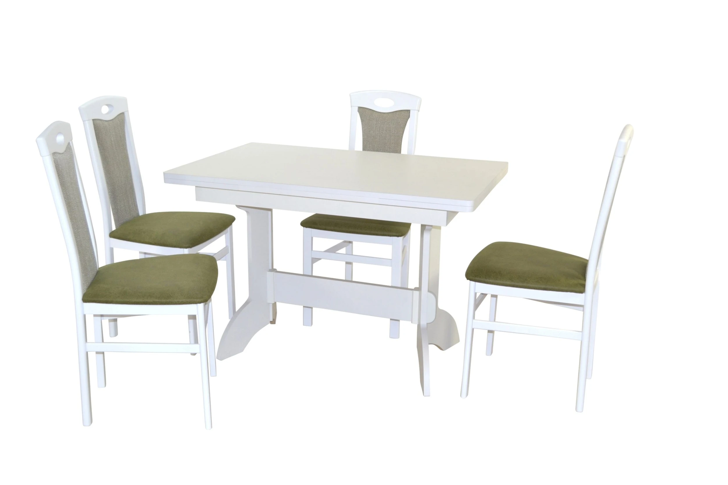Hochwertige 5tlg. Essgruppe bestehend aus 4 Massivholzstühlen und 1 Esstisch mit zwei Ansteckplatten zum Vergrößern. Stühle aus Massivholz Buche, weiß lackiert. Sitz und Rücken sind bequem schaumstoffgepolstert und mit attraktiven Stoffbezügen bezogen. Sitz mit einem Bezug in Kunstlederoptik (100% Polyester), Rücken mit einem Strukturstoffbezug (90% Polyester/10% Rayon). Praktisch die eingearbeitete Griffmuschel im oberen Rückenbereich. Esstisch mit zwei Ansteckplatten (je ca. 30 cm breit), die rechts/links unter der Tischplatte eingeschogen sind, dadurch lässt sich die Tischplatte einfach und schnell von 110 cm bis auf 170 cm vergrößern. Gestell vom Esstisch aus Massivholz Buche, weiß lackiert. Platten aus Holzwerkstoff die mit einem pflegeleichten Melamin-Holzdekor, weiß, beschichtet sind. Die Stühle werden montiert angeliefert, der Esstisch flach verpackt zur Selbstmontage, inklusive Aufbauanleitung. Maße ca. cm je Stuhl: (B/H/T) 45/95/48. Sitzhöhe ca. 46 cm, Sitztiefe ca. 39 cm. Maße ca. cm Esstisch: (B/H/T) 110-170/75/70.