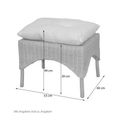 Hocker_Sitzhocker aus Rattan, handgeflochten in 2 Farben lieferbar. Wahlweise in dunkelbraun gebeizt und lackiert oder in beigefarben lackiert. Auflagekissen mit Schaumstofffüllung. Bezug 65% Baumwolle/35% Polyester, uni cremefarben. Im Lieferumfang ist Fuß-/Sitzhocker mit Kissen. Unser Tipp: Passenden Nostalgiesessel gleich mitbestellen. Maße vom Hocker ca. cm B. 53 x T. 40 x H. 40 cm.