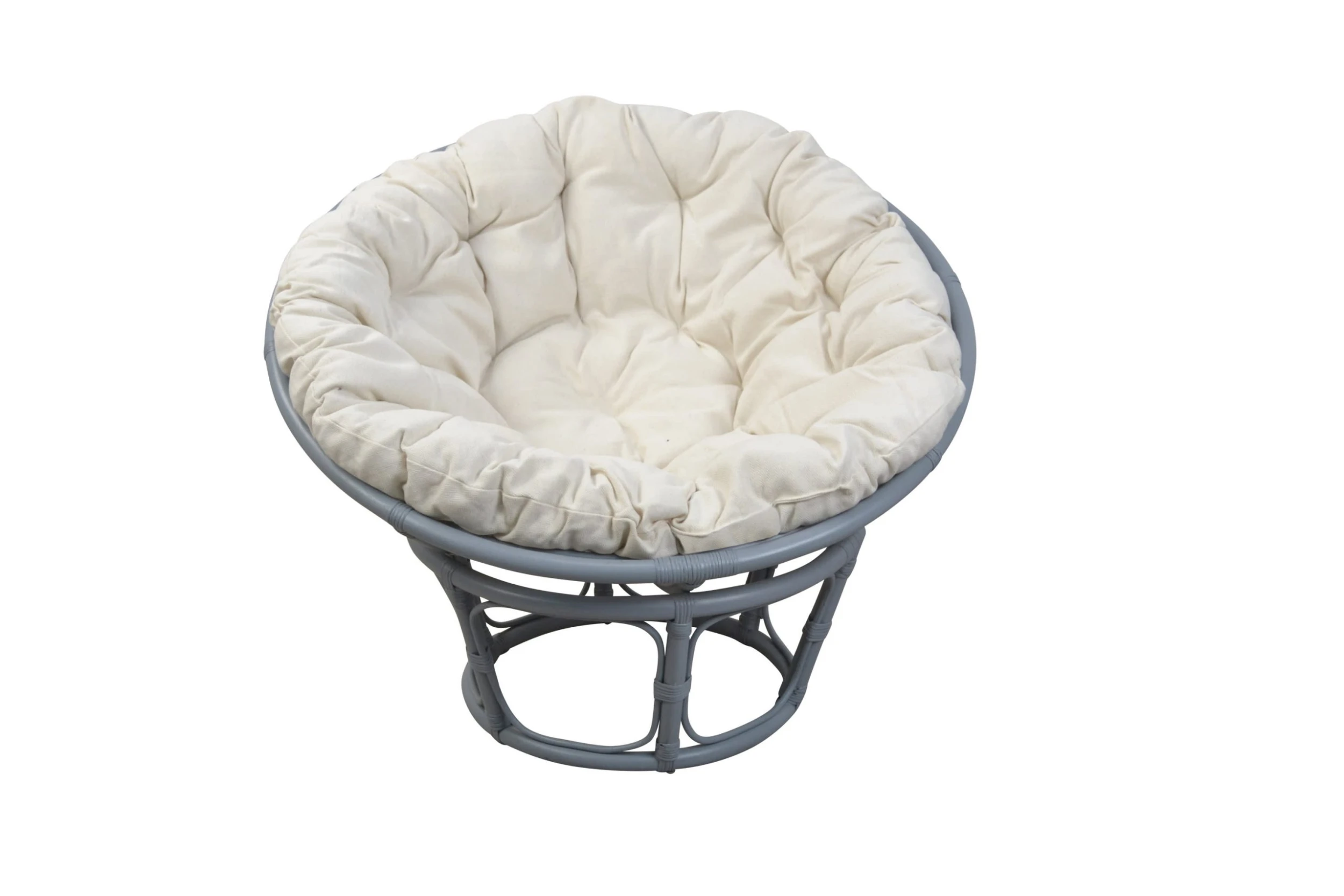 Trendiger Papasansessel komplett aus Rattanrohr, handgeflochten und trendig uni grau lackiert. Die runde Sitzschale, Ø 100 cm, einfach auf das Untergestell auflegen und fertig. Gesamtmaße ca. cm: Ø 100 x H. 60 cm. Inklusive extra stark gepolsterter Kissenauflage, mit softweicher Vliesfüllung gefüllt und formstabild abgesteppt. Stoffbezug (100% Polyester), uni cremefarben. Kissen nicht waschbar, grobe Verschmutzungen max. mit einem leicht angefeuchteten Tuch abtupfen. Lieferung erfolgt montiert per Spedition.