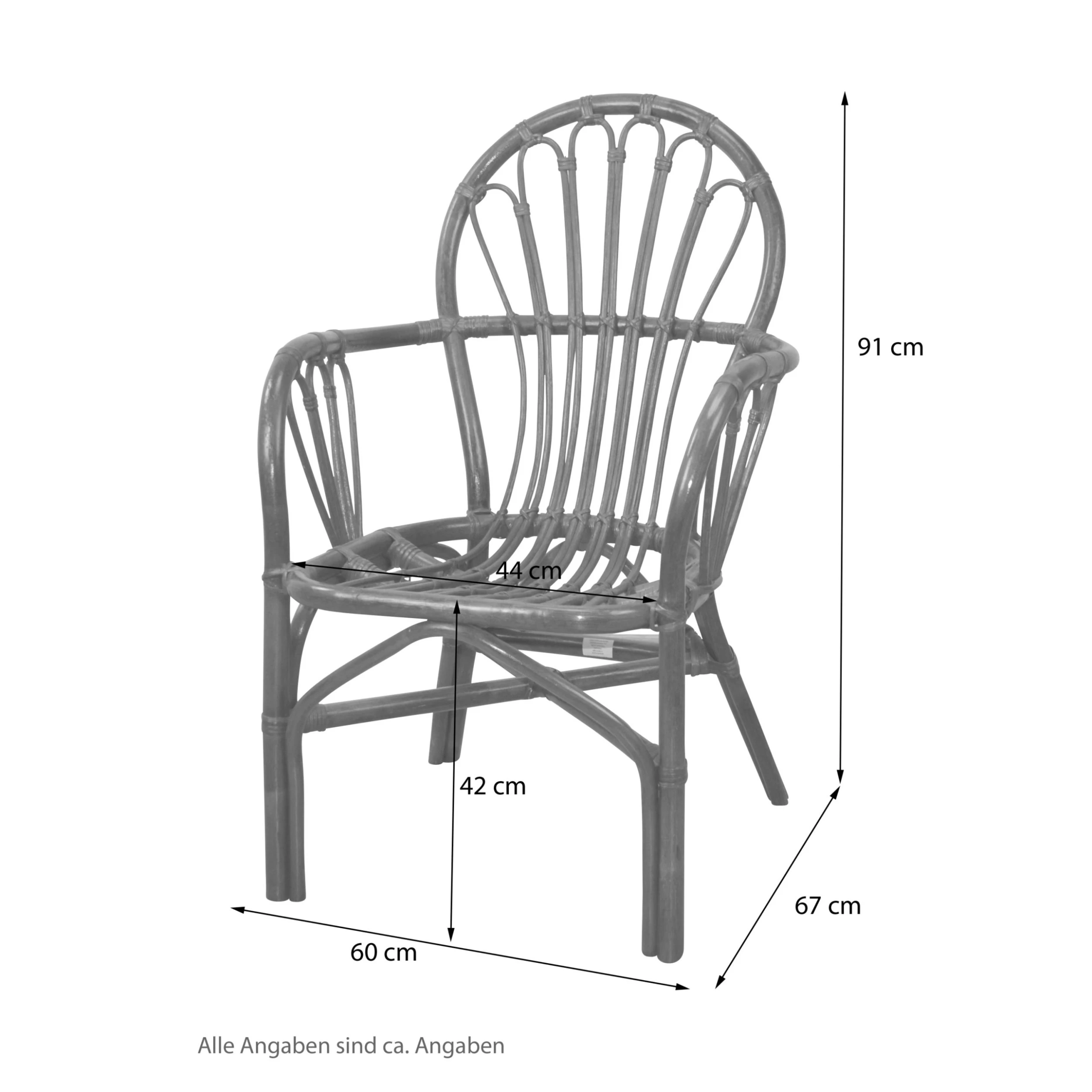 Moderner Rattansessel im 2er-Set komplett aus Rattanrohr, handgeflochten. Armlehnen und Rückenlehne mit schöner Verzierung gearbeitet. Die pflegeleichte Oberfläche ist lackiert. Maße ca. cm: B. 60 x T. 67 x H. 91 cm. Sitzhöhe ca. 42 cm, Sitzbreite ca. 44 cm. Sitzmöbel wird montiert angeliefert.