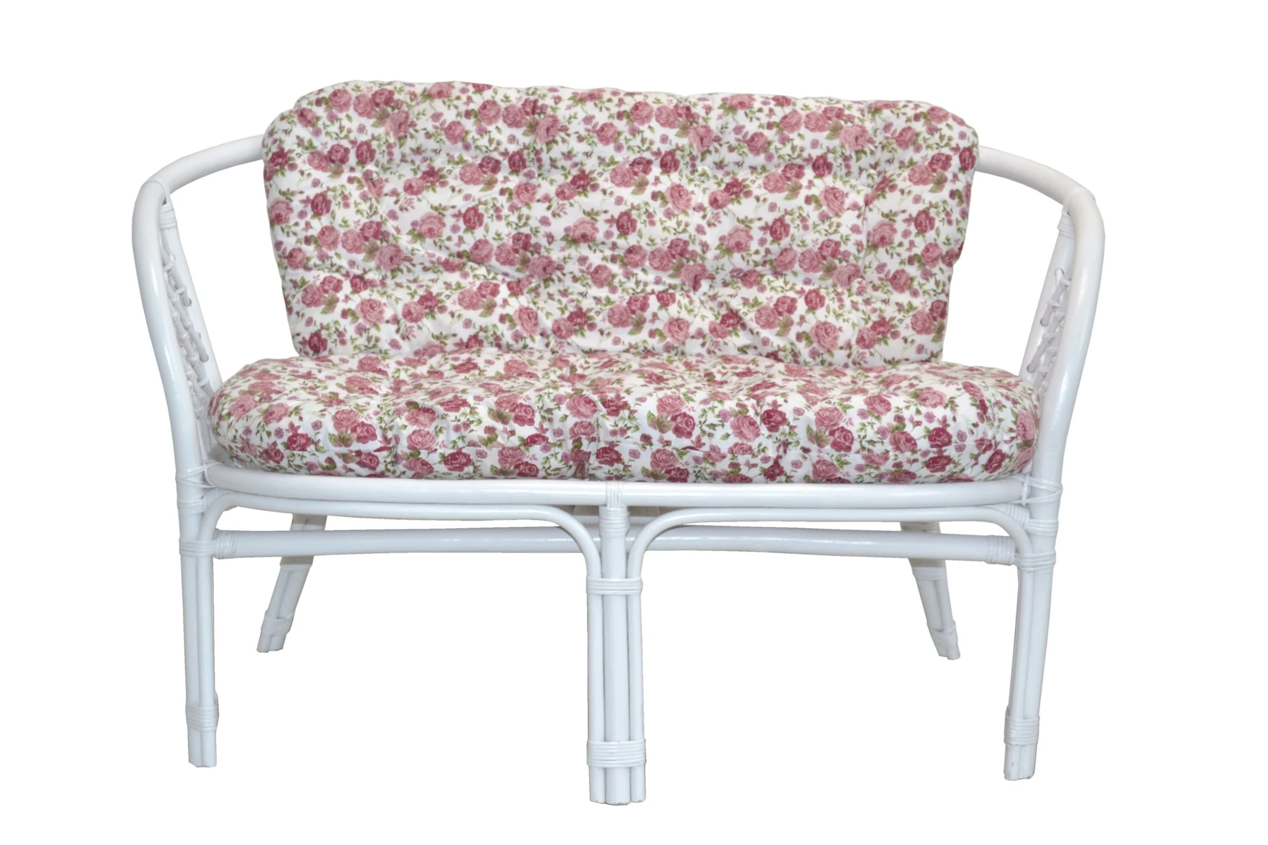 Sitzbank aus Rattan, handgeflochten, weiß lackiert, inklusive passenden Sitz-/Rückenkissen. Die Kissen sind mit einer bequemen Vliesfüllung extra stark gefüllt und mit einem Stoffbezug (60% Baumwolle/40% Polyester), cremefarben mit Rosenmotiv, bezogen und formstabil abgesteppt. Kissenbezüge nicht abnehmbar, da abgesteppt und nicht waschbar. Verschmutzungen mit einem leicht angefeuchtetem Tuch abtupfen. Sitzbank wird montiert, per Spedition angeliefert. Lieferung nur innerhalb Deutschland möglich, ausgenommen Insellieferungen. Maße ca. cm: B. 110 x T. 69 x H. 83 cm. Sitzhöhe mit Kissen ca. 49 cm. Sitzbank nicht für den Außen-/Gartenbereich geeignet.