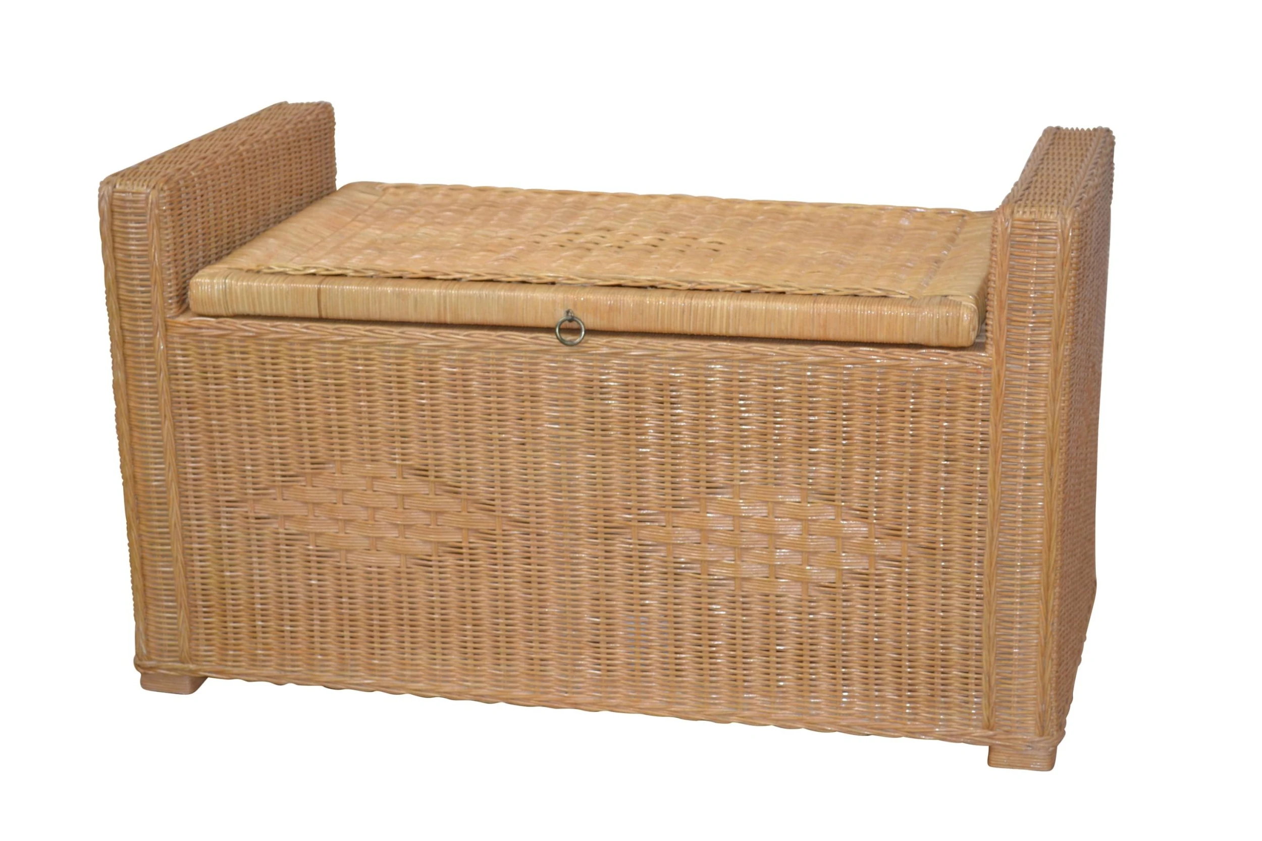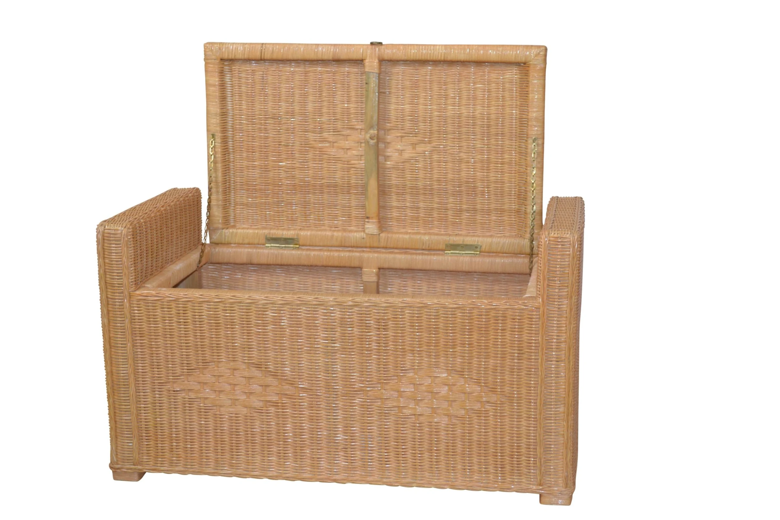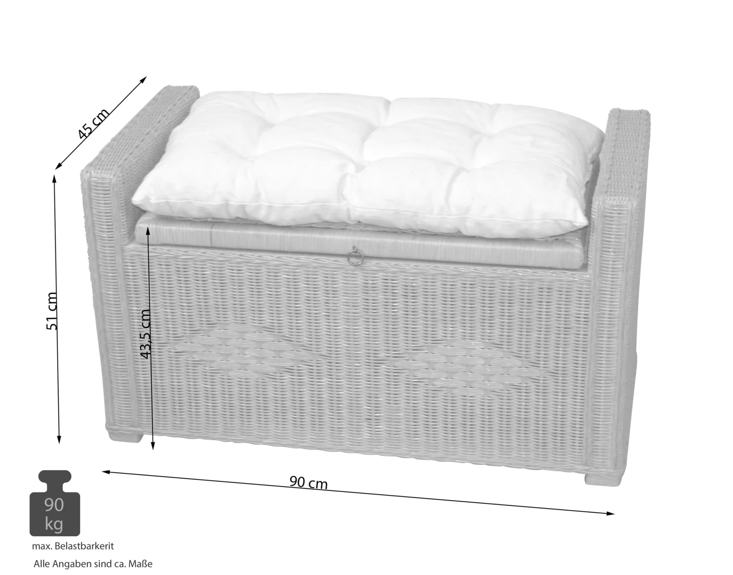 Rattansitztruhe mit Stauraum unter der Sitzfläche. Stabiles Gestell aus Massivholz, mit Rattangeflecht, aufwendig handgeflochten, erlefarben gebeizt und lackiert. Artikel wird aufgebaut geliefert, einfach nur auspacken. Die aufklappbare Sitzfläche ist mit Metallscharnieren und Metallkette (rechts/links), jeweils messingfarben befestigt, darunter ist Stauraum für z. B. Wäsche. Stauraum unter der Sitzfläche ca.: B. 66 x T. 36 x H. 32 cm. Gesamtmaße ca. B. 90 x T. 45 x H. 51 cm. Sitzhöhe ca. 43,5 cm.