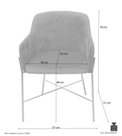 Moderner Polsterstuhl mit einem stabilen Stahlrohrgestell, goldfarben beschichtet. Sitzschale komplett schaumstoffgepolstert und mit einem trendigen Samtbezug (100% Polyester) bezogen. Lieferung zerlegt mit Aufbauanleitung. Maße ca. cm: B. 57 x T. 57 x H. 78 cm. Sitzhöhe ca. 47 cm, Sitztiefe ca. 45 cm, Sitzbreite ca. 47 cm. Armlehnenhöhe ca. 64 cm.