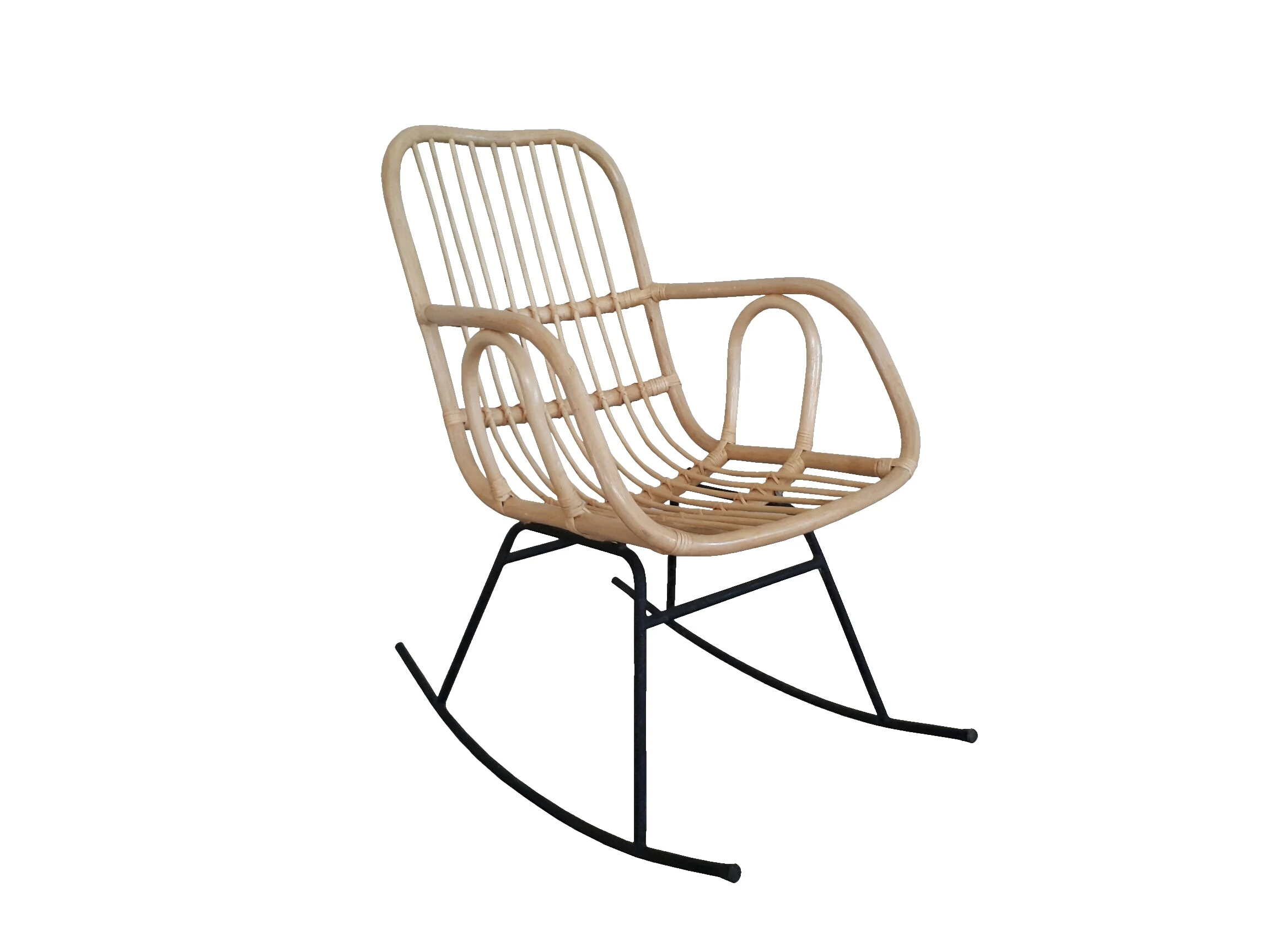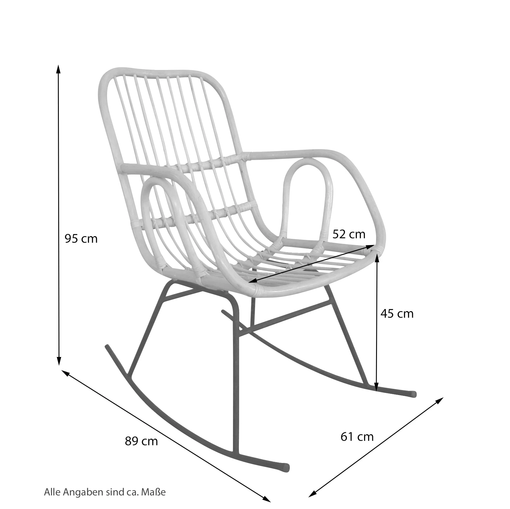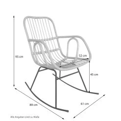 Moderner Schaukelsessel mit einem Gestell aus Eisen, schwarz pulverbeschichtet. Sitzschale aus Rattanrohr, handgeflochten und trendig naturfarben gebeizt und lackiert. Sitzhöhe ca. 44 cm, Sitzbreite ca. 52 cm. Artikel wird teilzerelegt angeliefert. Gesamtmaße ca. cm: B. 57 x T. 84 x H. 95 cm.