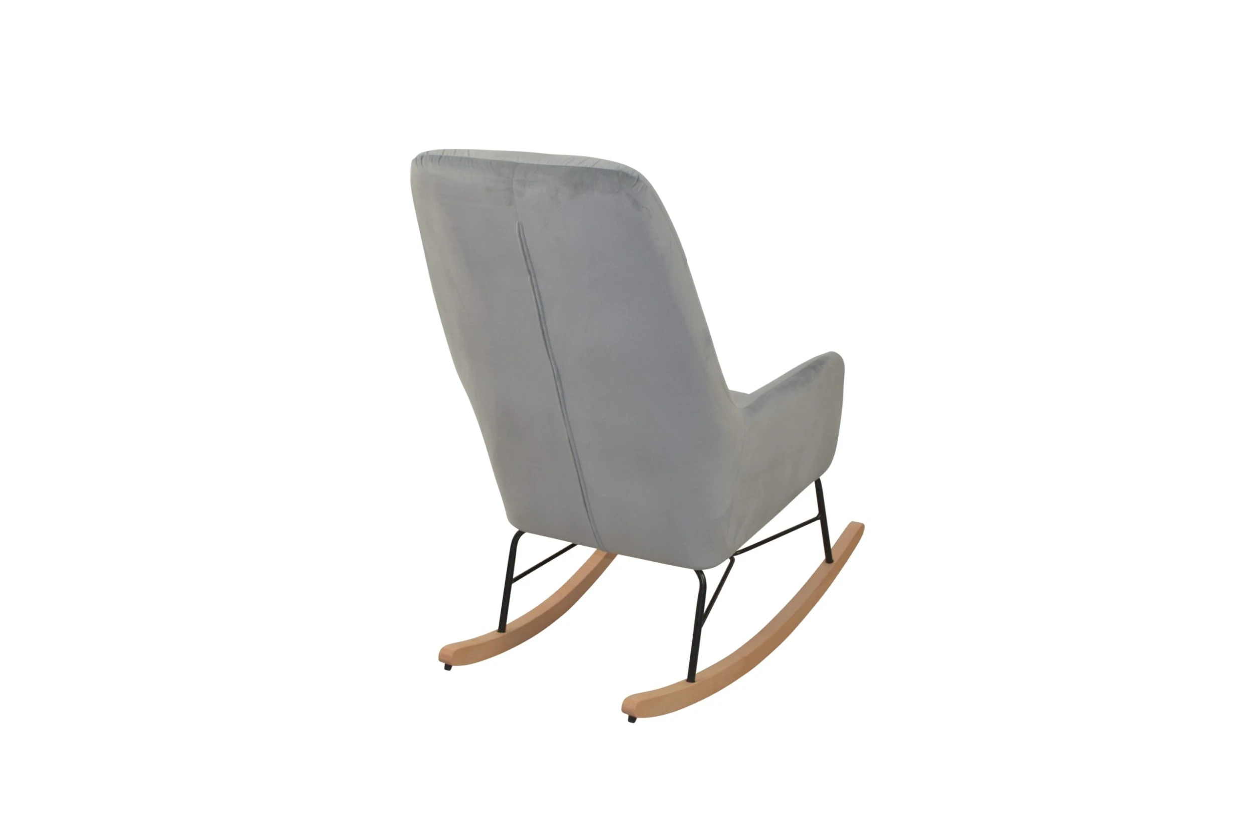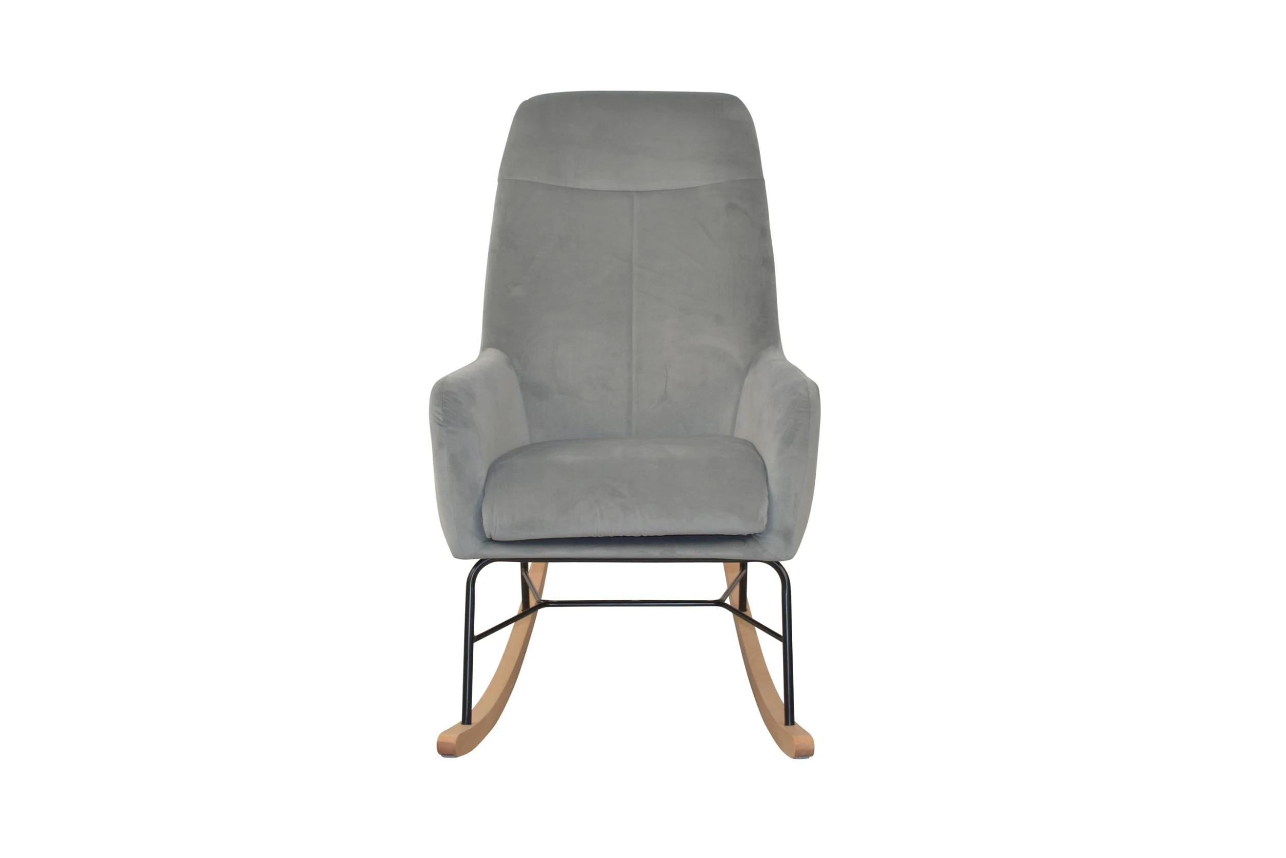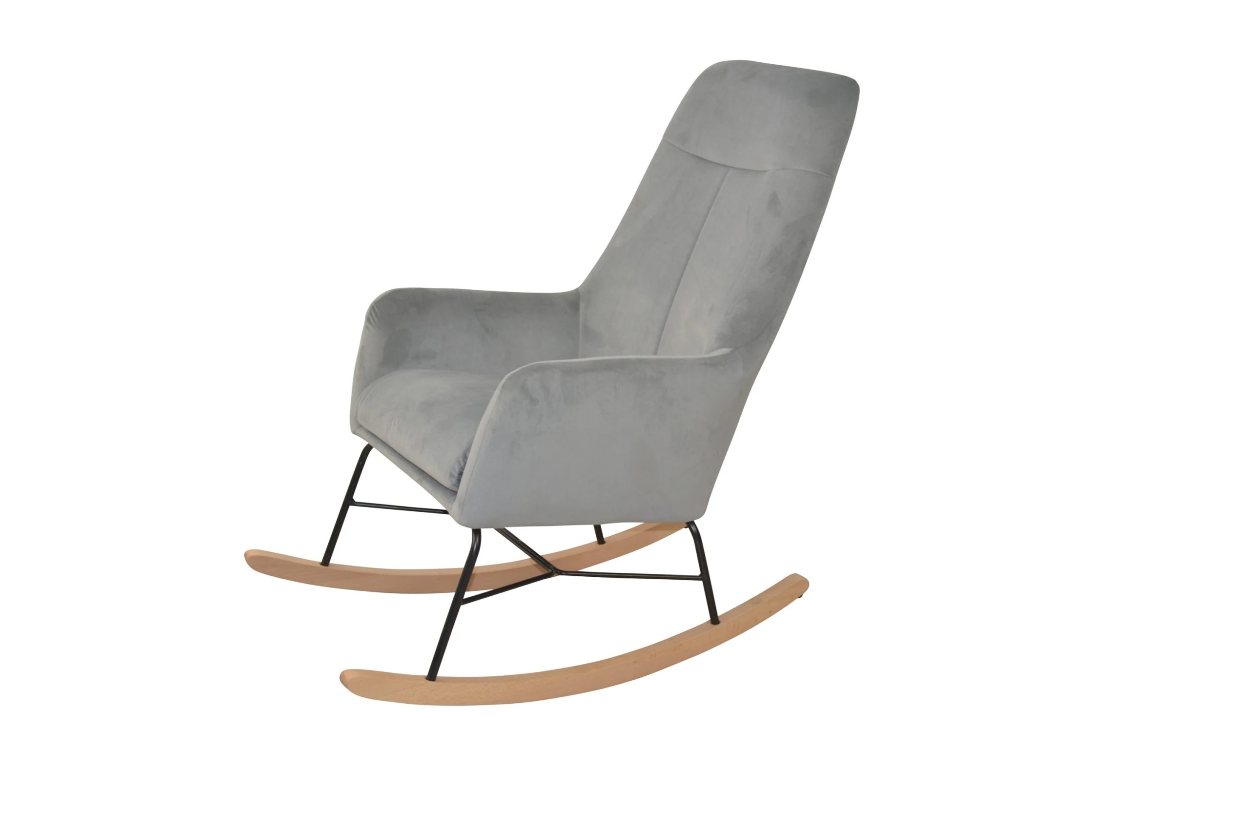 Moderner Schaukelsessel mit einem Gestell aus Metall, schwarz pulverbeschichtet. Kufen aus Massivholz, buchefarben gebeizt und lackiert. Bequeme, große Sitzschale, komplett schaumstoffgepolstert und mit einem Samtbezug (100% Polyester) bezogen. Lieferung vom Schaukelsessel erfolgt teilzerlegt, inklusive Aufbauanleitung. Maße ca. cm: (B/H/T) 63/103/104. Sitzmaße ca. cm: (B/H/T) 45/53/49. Armlehnenhöhe ca. 63 cm. Lieferbare Farben: grau, beige und braun