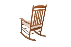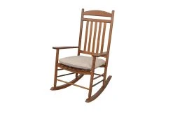 Bequemer Schaukelstuhl aus Massivholz Pappel, braun gebeizt und lackiert. Lieferung vom Schaukelstuhl erfolgt zur Selbstmontage, inklusive Aufbauanleitung. Maße ca. cm (B/H/T) 69/113/86 cm. Sitzhöhe ca. 46,5 cm, Sitzbreite vorne 52 // hinten 46 cm. Sitztiefe 52 cm. Rückenlehnenhöhe ca. 77 cm. Armlehnenhöhe ca. 63 cm. Inklusive passendem Sitzkissen mit bequemer Vliesfüllung, extra stark (ca. 6 cm) befüllt. Stoffbezug beigefarben (65% Baumwolle/35% Polyester) mit praktischen Befestigungsbändern.