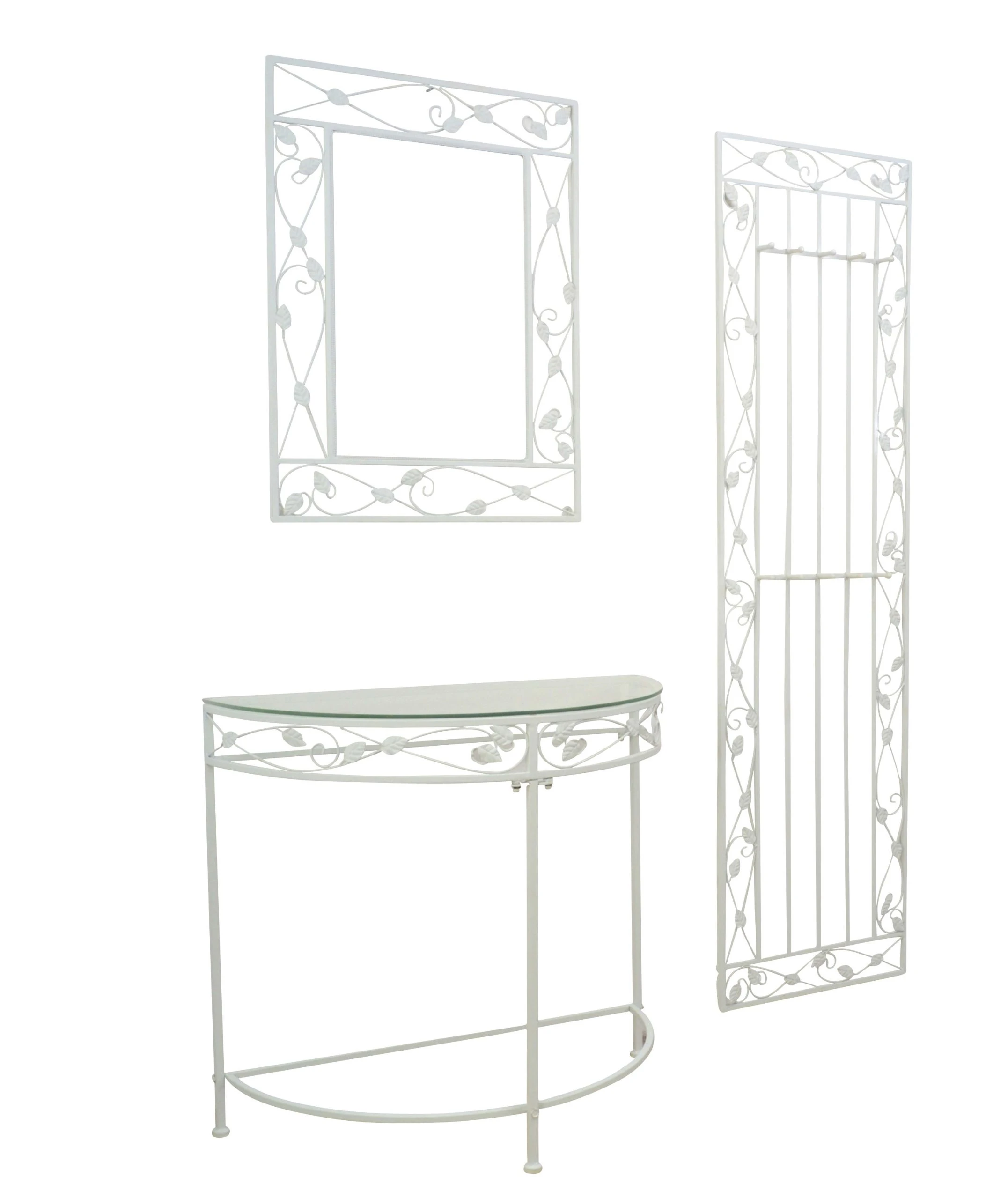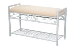 Trendige Sitzbank mit Kissenauflage, aus Metall mit einer schönen Metallverzierung und Blätterornamenten. Die pflegeleichte Oberfläche ist weiß, pulverbeschichtet. Das Sitzkissen ist schaumstoffgepolstert und mit einem cremefarbenen Stoffbezug (100% Polyester) bezogen. Unten ein praktischer Gitterablageboden aus Metall.. Maße ca. cm: 80 x T. 30 x H. 47 cm. Belastbarkeit ca. 90 cm. Lieferung erfolgt zerlegt, mit Aufbauanleitung. Abgebildeter Wandspiegel, Wandgarderobe und Konsolentisch auch lieferbar.