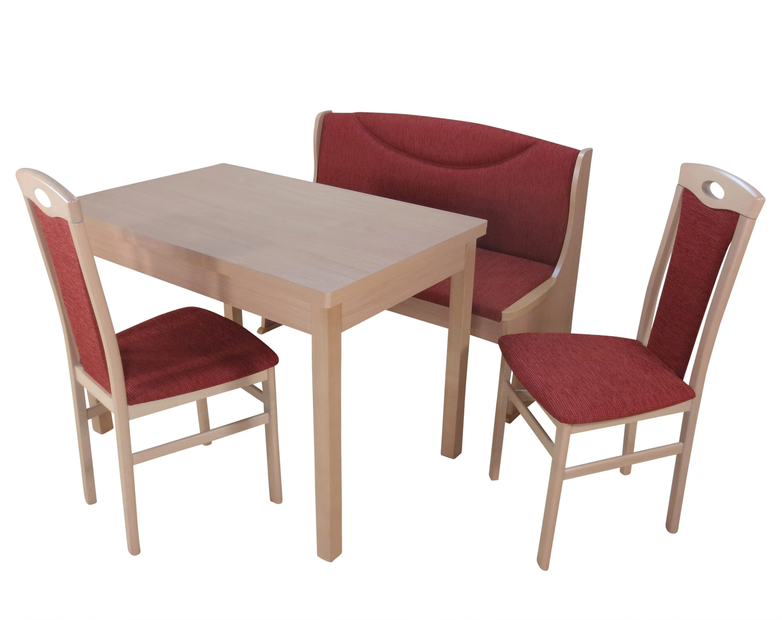 Eine teilmassive Essgruppe welche für formschönes Design mit viel Sinn für Gemütlichkeit steht. Wahlweise lieferbar in sieben unterschiedlichen Varianten mit harmonierenten Stoffbezügen. Die Gruppe wirkt bequem und freundlich und kann auch in kleineren Küchen zur optimalen Raumausnutzung angebracht werden. Eine kompakte Truhenbank ausgestattet mit massivem Bucheholzteilen und robusten & pflegeleichten Melaminoberflächen sorgt für Behaglichkeit. Die mit Qualitätsschaumstoff gepolsterten Sitz-und Rückenkissen weisen eine attraktive Ziersteppung auf und sind mit strapazierfähigen Strukturstoffen bezogen. Unter der Sitzfläche befindet sich eine Truhe welche für zusätzlichen Stauraum sorgt. Diese ist mit einer Gasdruckfedern gesichert und garantiert eine verletzungsfreie Handhabung durch die langsame Absenkung des Truhendeckels. Beide Stühle und das Untergestell des rechteckigenVierfußtisches sind aus massiver Buche während die Tischplatte mit einer robusten, pflegeleichten Melaminoberfläche in Holzoptik aufwartet. Zwei seitliche Auszugplatten je ca. 30 cm sorgen bei mehr Platzbedarf für eine schnelle Vergrößerung des Tisches. Einfache Reinigung nur mit einem leicht feuchten Tuch abwischen und trocken nachpolieren. Die Verarbeitung aller Einzelteile garantiert eine hohe Stabilität und lange Nutzungsdauer. Schaffen Sie eine behagliche und gemütliche Atmosphäre in Ihrem Zuhause.