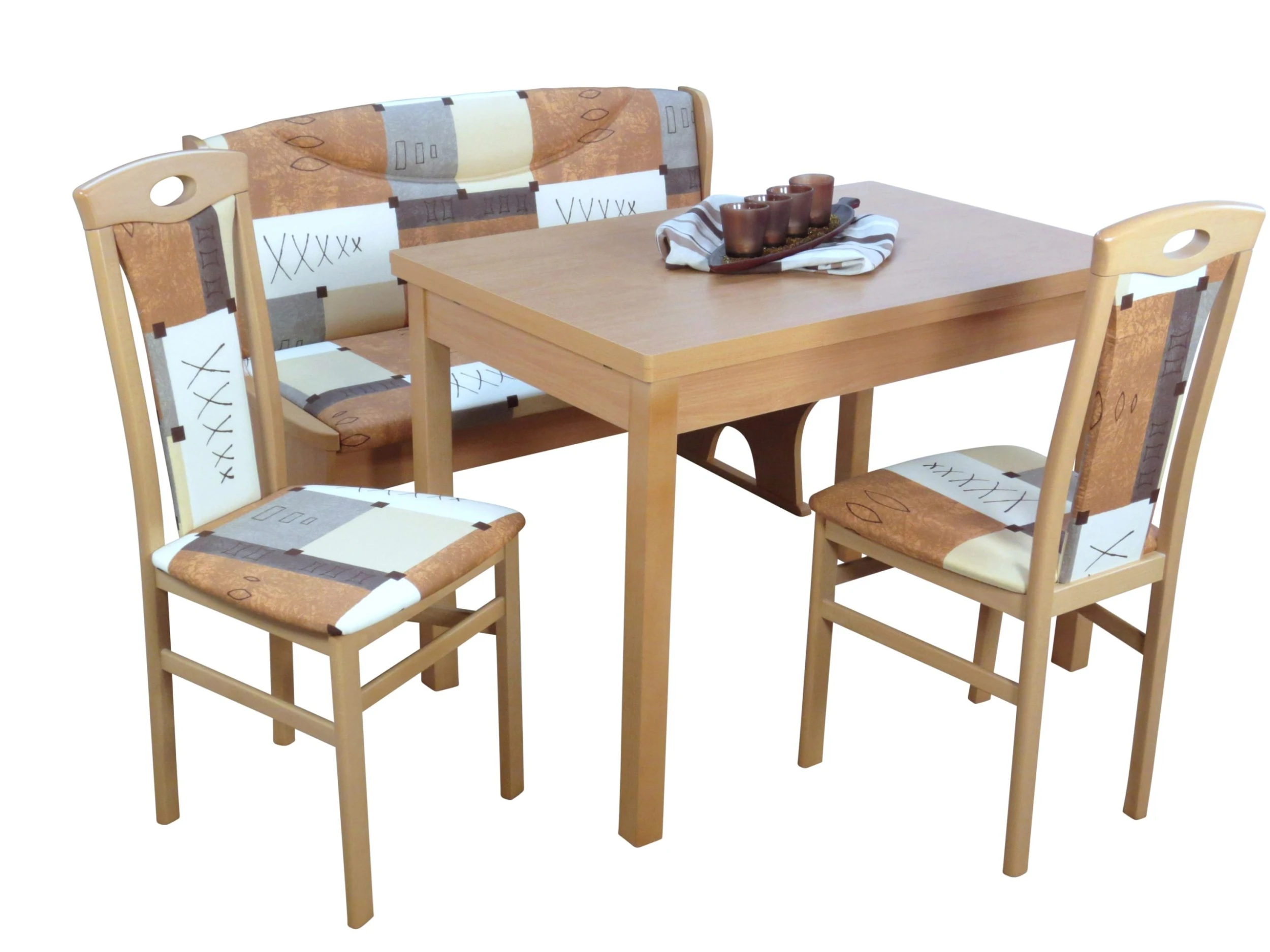 Eine teilmassive Essgruppe welche für formschönes Design mit viel Sinn für Gemütlichkeit steht. Wahlweise lieferbar in drei Holzfarben mit harmonierenten Stoffbezügen. Die Gruppe wirkt hell und freundlich und kann auch in kleineren Küchen zur optimalen Raumausnutzung angebracht werden. Eine kompakte Truhenbank ausgestattet mit massivem Bucheholzteilen und folierten Spanplatten sorgt für Behaglichkeit. Die mit Qualitätsschaumstoff gepolsterten Sitz-und Rückenkissen weisen eine attraktive Ziersteppung auf und sind mit farbenfrohen, strapazierfähigen Baumwollstoffen (100% Baumwolle) bezogen. Unter der Sitzfläche befindet sich eine Truhe die für zusätzlichen Stauraum sorgt. Diese ist mit einer Gasdruckfedern gesichert und garantiert eine verletzungsfreie Handhabung des Truhendeckels. Beide Stühle und das Untergestell des rechteckigen Vierfußtisches sind aus massiver Buche während die Tischplatte mit einer robusten, pflegeleichten Melaminoberfläche in Holzoptik aufwartet. Zwei seitliche Auszugplatten je ca. 30 cm sorgen bei mehr Platzbedarf für eine schnelle Vergrößerung des Tisches. Einfache Reinigung nur mit einem leicht feuchten Tuch abwischen und trocken nachpolieren. Die Verarbeitung aller Einzelteile garantiert eine hohe Stabilität und lange Nutzungsdauer. Schaffen Sie eine behagliche und gemütliche Atmosphäre in Ihrem Zuhause.