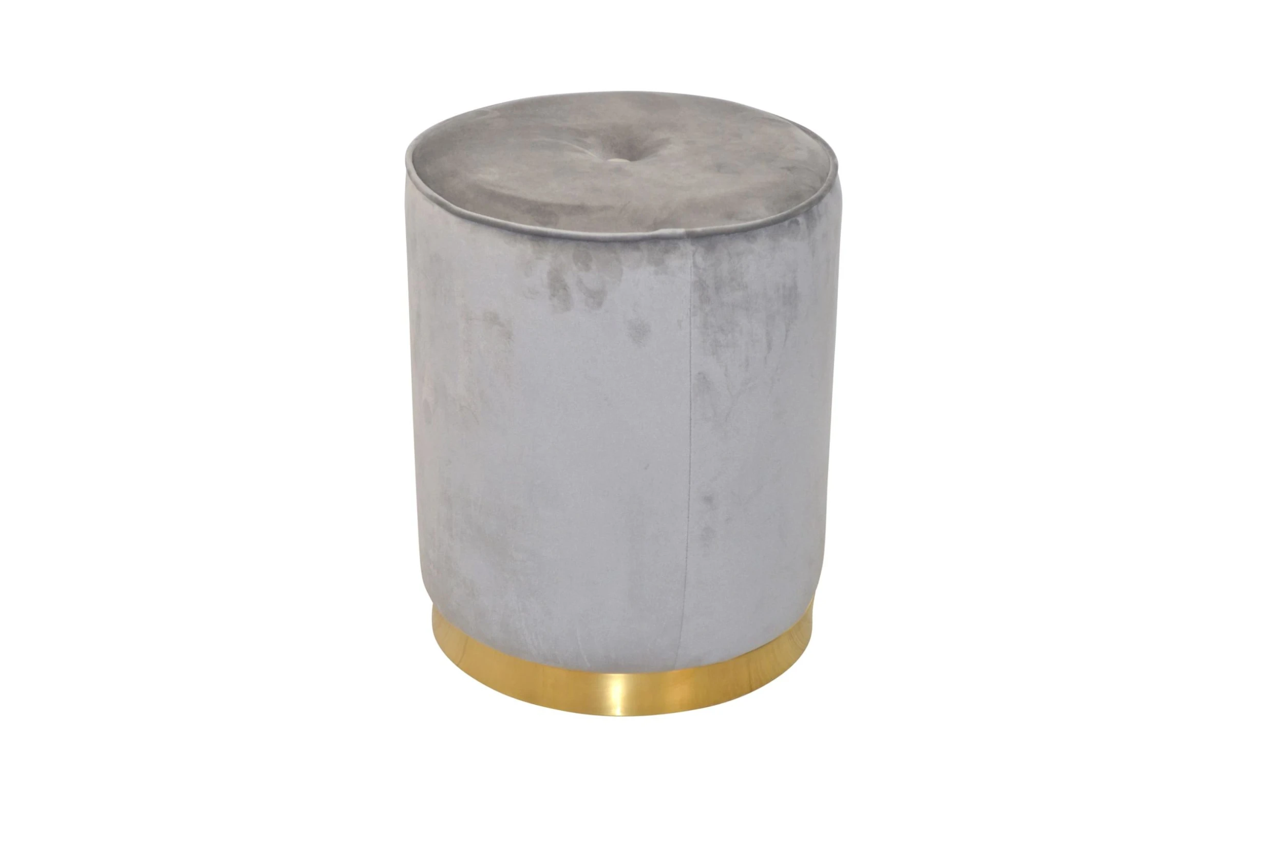 Trendiger Sitzhocker mit einem Korpus teils aus Holzwerkstoff, teils aus MDF, komplett schaumstoffgepolstert und unten mit einem goldfarbenen Metallring gearbeitet. Die Sitzfläche ist mit einem umlaufenden Keder gearbeitet und in der Mitte mit Knopfsteppung versehen. Bezogen ist der Hocker mit einem attraktiven Samtstoffbezug (100% Polyester), unifarben. Lieferung vom Hocker erfolgt montiert. Maße ca. cm: (ØxH) 34,5×42,5 cm.