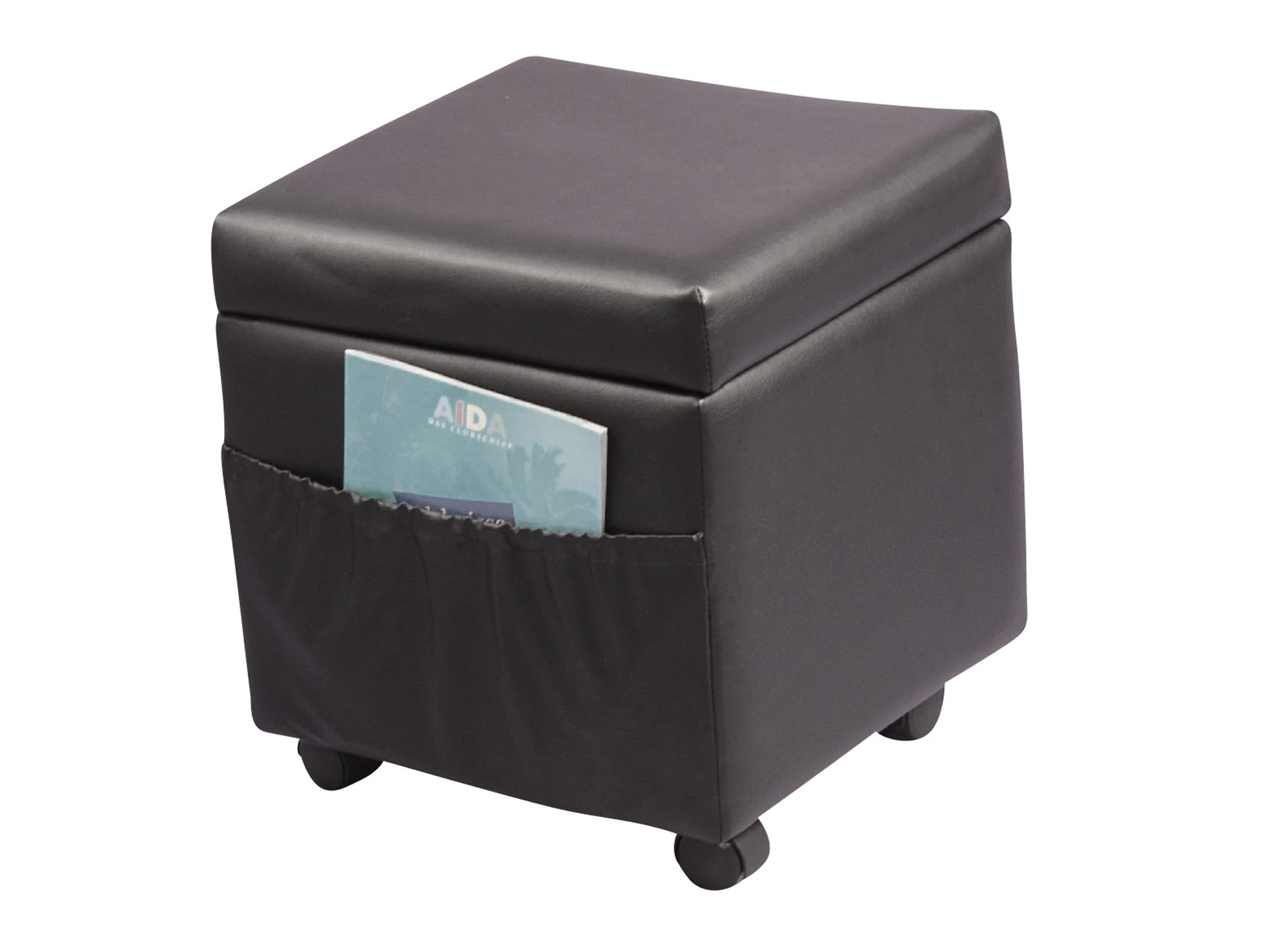 Funktioneller, praktischer Sitzwürfel in 3 Farben lieferbar. Abnehmbarer Deckel, darunter Stauraum, mit Stoffbezug ausgeschlagen. Mit 2 Taschen für z. B. Zeitschriften usw. und zusätzlich 4 Rollen. Stabiler Holzrahmen. Korpus und MDF-Deckel sind mit einem Lederimitatbezug, braun, cremeweiß oder schwarz bezogen.