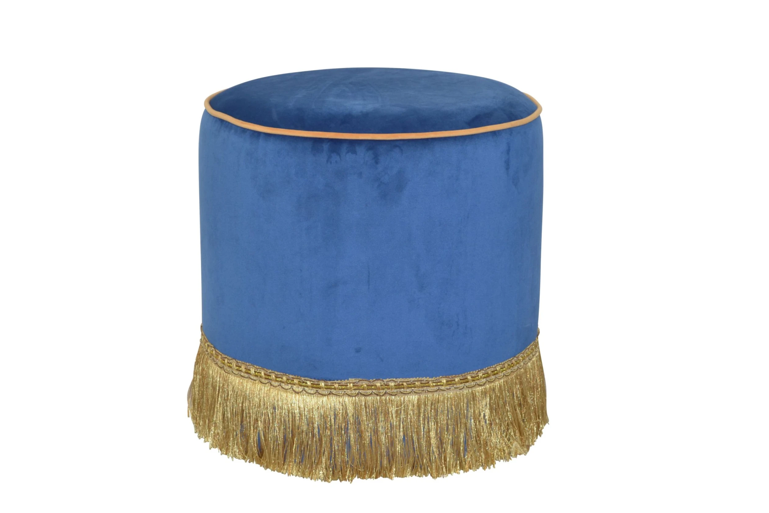 Moderner Sitzpouf mit einem stabilem Gestell teils aus Holz, teils aus MDF, komplett schaumstoffgepolstert und mit einem trendigen Samtbezug (100% Polyester) bezogen. Sitzfläche mit einen farblich abgesetzten Keder kombiniert. Zusätzlich mit einer trendigen, goldfarben Fransenborte unten gearbeitet. Maße ca. cm: Durchmesser 45 x H. 46 cm. Artikel wird montiert angeliefert.