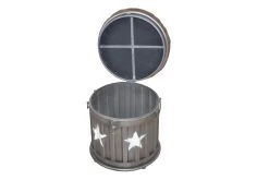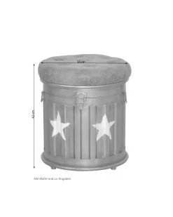 Moderner Sitzhocker aus Metall mit einer aufklappbaren Sitzfläche, darunter praktischer Stauraum. Der Metallkorpus ist im Industrielook, antik silbergrau beschichtet und mit cremeweißen Sternen kombiniert. Rechts/links mit Metallgriffen gearbeitet und der schaumstoffgepolsterte aufklappbare Deckel bzw. die Sitzfläche ist mit einem Klappverschluss versehen. Bezogen ist die Sitzfläche mit einem pfelgeleichten Mikrofaserbezug (100% Polyester), antik braun, zusätzlich noch formstabil abesteppt. Artikel wird montiert geliefert. Maße ca. cm: Durchmesser 36 x Höhe 46,5 cm. Staurauminnenmaß ca. Durchmesser 31 x Höhe 35 cm.