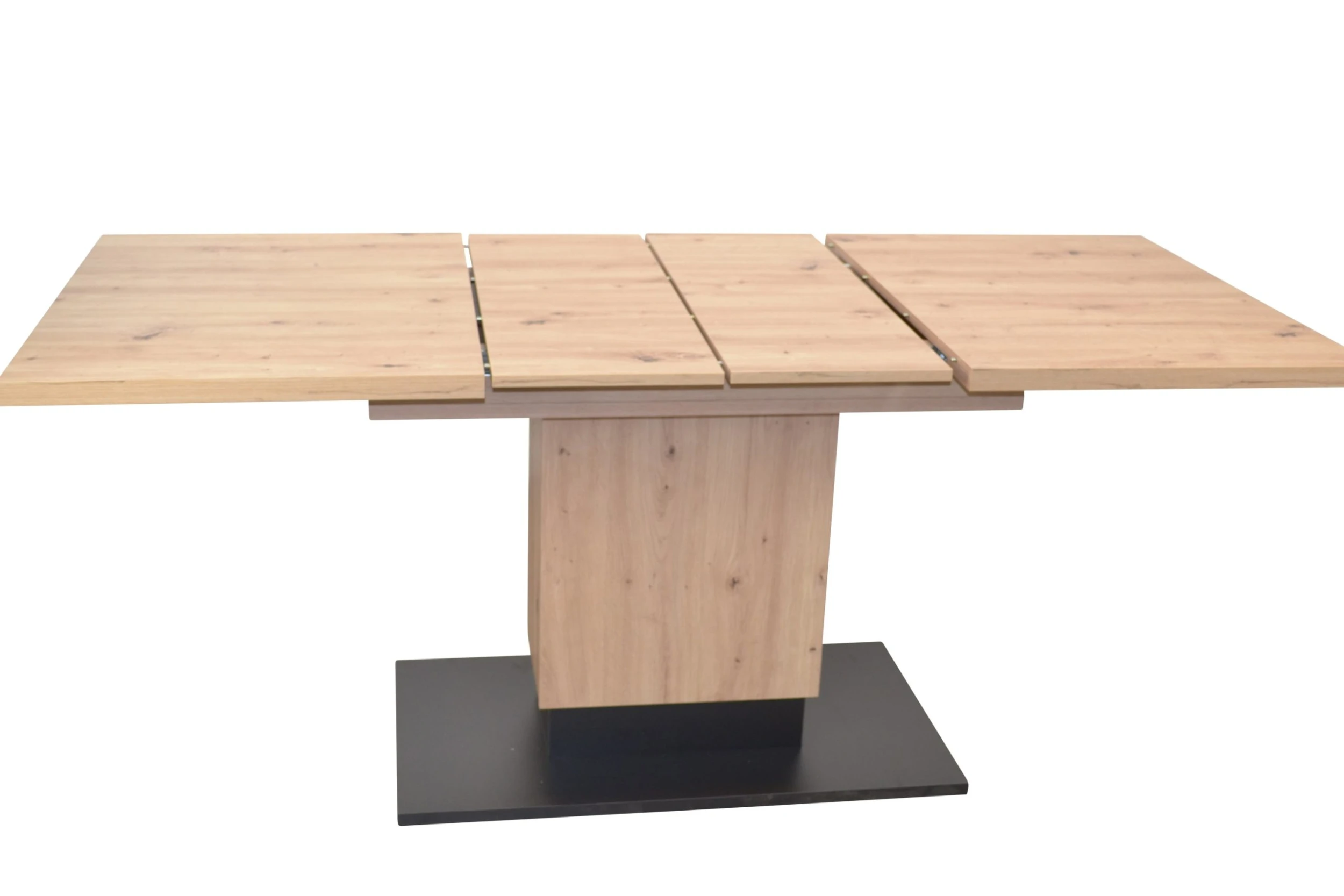 Moderne 5tlg. Sitzgruppe bestehend aus einem Esstisch mit Auszugsfunktion und 4 hochwertigen Schwingstühlen. Moderner Esstisch komplett aus Holzwerkstoff gefertigt und mit einem pflegeleichten Melamin-Holzdekor, Artisan-Eiche-Nachbildung, beschichtet. Stabiles Säulengestell, Bodenplatte uni schwarz. Die Tischplatte ist in der Mitte geteilt und lässt sich schnell und einfach dank der zwei Metall-Synchronauszügen auseinander ziehen. Darunter befinden sich zwei eingelegte Erweiterungsplatten (je ca. 30 cm breit), dadurch lässt sich die Tischplatte von 120 cm bis auf 180 cm vergrößern. Die Stühle haben ein schwarzes Metallgestell, Sitz und Rücken sind bequem schaumstoffgepolstert und mit einem Mikrofaser-Stoffbezug (100% Polyester) im Vintage-Look, bezogen. Esstisch und Stühle werden zur Selbstmonage, inklusive Aufbauanleitung angeliefert. Maße ca. cm: Esstisch (B/H/T) 120-180/76/80 // Stühle (B/H/T) 43/92/59. Sitzöhe ca. 47 cm.
