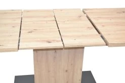 Moderne 5tlg. Sitzgruppe bestehend aus einem Esstisch mit Auszugsfunktion und 4 hochwertigen Schwingstühlen. Moderner Esstisch komplett aus Holzwerkstoff gefertigt und mit einem pflegeleichten Melamin-Holzdekor, Artisan-Eiche-Nachbildung, beschichtet. Stabiles Säulengestell, Bodenplatte uni schwarz. Die Tischplatte ist in der Mitte geteilt und lässt sich schnell und einfach dank der zwei Metall-Synchronauszügen auseinander ziehen. Darunter befinden sich zwei eingelegte Erweiterungsplatten (je ca. 30 cm breit), dadurch lässt sich die Tischplatte von 120 cm bis auf 180 cm vergrößern. Die Stühle haben ein schwarzes Metallgestell, Sitz und Rücken sind bequem schaumstoffgepolstert und mit einem Mikrofaser-Stoffbezug (100% Polyester) im Vintage-Look, bezogen. Esstisch und Stühle werden zur Selbstmonage, inklusive Aufbauanleitung angeliefert. Maße ca. cm: Esstisch (B/H/T) 120-180/76/80 // Stühle (B/H/T) 43/92/59. Sitzöhe ca. 47 cm.