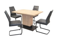 Moderne 5tlg. Sitzgruppe bestehend aus einem Esstisch mit Auszugsfunktion und 4 hochwertigen Schwingstühlen. Moderner Esstisch komplett aus Holzwerkstoff gefertigt und mit einem pflegeleichten Melamin-Holzdekor, Artisan-Eiche-Nachbildung, beschichtet. Stabiles Säulengestell, Bodenplatte uni schwarz. Die Tischplatte ist in der Mitte geteilt und lässt sich schnell und einfach dank der zwei Metall-Synchronauszügen auseinander ziehen. Darunter befinden sich zwei eingelegte Erweiterungsplatten (je ca. 30 cm breit), dadurch lässt sich die Tischplatte von 120 cm bis auf 180 cm vergrößern. Die Stühle haben ein schwarzes Metallgestell, Sitz und Rücken sind bequem schaumstoffgepolstert und mit einem Mikrofaser-Stoffbezug (100% Polyester) im Vintage-Look, bezogen. Esstisch und Stühle werden zur Selbstmonage, inklusive Aufbauanleitung angeliefert. Maße ca. cm: Esstisch (B/H/T) 120-180/76/80 // Stühle (B/H/T) 43/92/59. Sitzöhe ca. 47 cm.