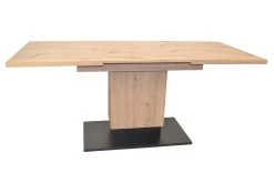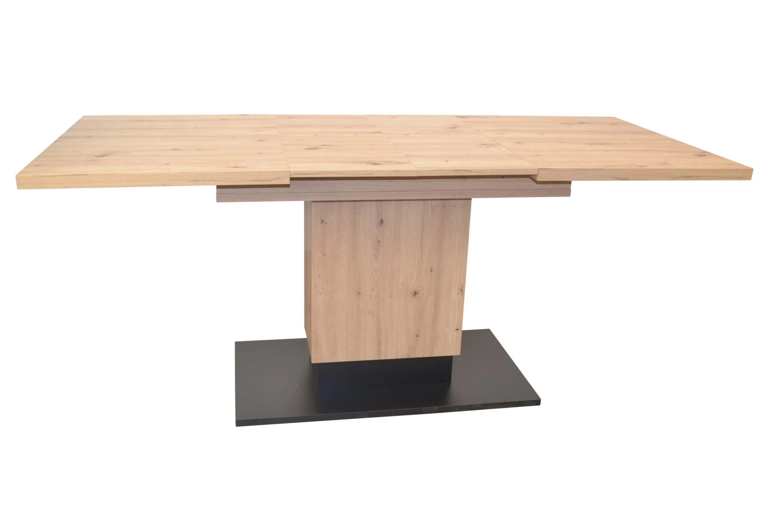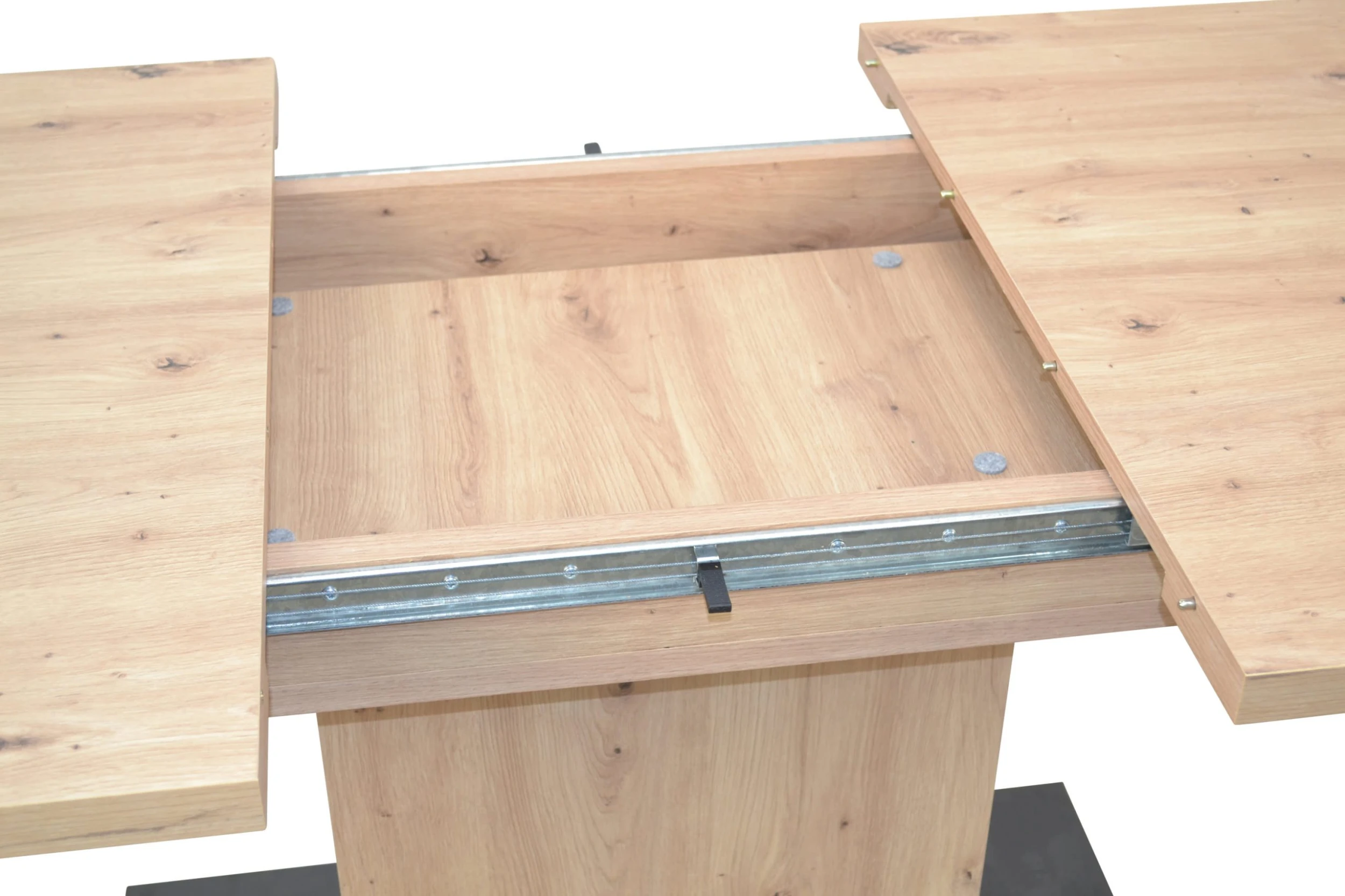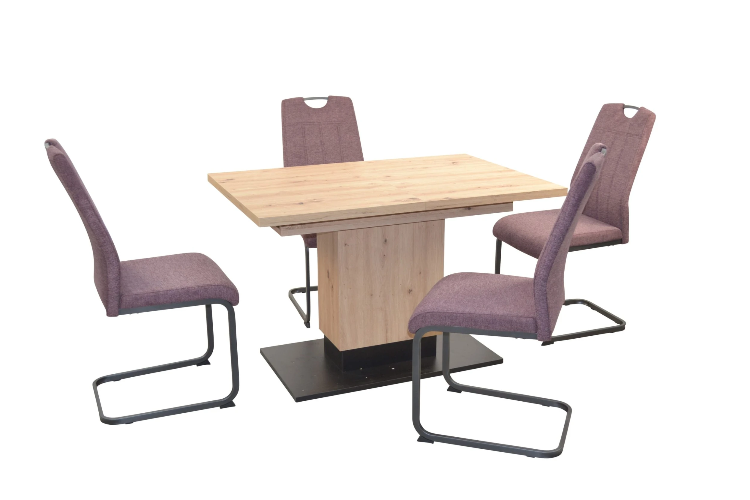 Moderne 5tlg. Sitzgruppe bestehend aus einem Säulen-Esstisch mit Auszugsfunktion und 4 hochwertigen Schwingstühlen. Der moderner Esstisch ist komplett aus Holzwerkstoff gefertigt und mit einem pflegeleichten Melamin-Holzdekor, Artisan-Eiche-Nachbildung, beschichtet. Stabiles Säulengestell, Bodenplatte uni schwarz. Die Tischplatte ist in der Mitte geteilt und lässt sich schnell und einfach dank der zwei Metall-Synchronauszügen auseinander ziehen. Darunter befinden sich zwei eingelegte Erweiterungsplatten (je ca. 30 cm breit), dadurch lässt sich die Tischplatte von 120 cm bis auf 180 cm vergrößern. Die 4 Stühle haben ein schwarzes Stahlrohrgestell, Sitz und Rücken sind bequem schaumstoffgepolstert und mit einem attraktiven Stoffbezug (100% Polyester), wahlweise in grau, grün oder bordeauxfarben bezogen. Esstisch und Stühle werden zur Selbstmonage, inklusive Aufbauanleitung angeliefert. Maße ca. cm: Esstisch (B/H/T) 120-180/76/80 // Stühle (B/H/T) 44/99/61. Sitzöhe ca. 47 cm. Sitztiefe ca. 43 cm
