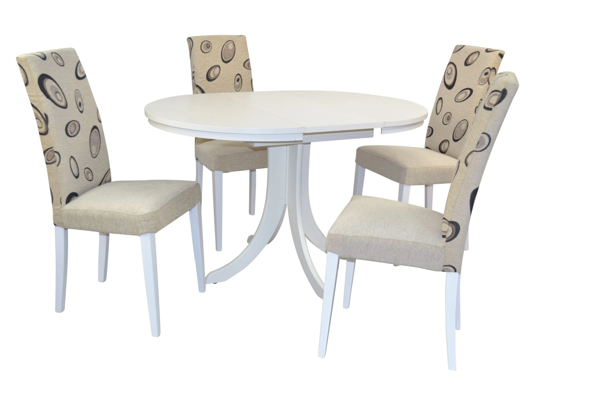 5tlg. Tischgruppe bestehend aus vier Polsterstühlen und einen runden Esstisch mit Auszugsfunktion. Die Beine der Stühle sind aus Massivholz Buche, weiß lackiert. Sitz und Rücken sind schaumstoffgepolstert und mit attraktiven Stoffbezug bezogen. Sitz unifarben, Rücken gemustert. Die Beine vom ovalen Esstisch sind aus Massivholz, weiß lackiert, die ausziehbare Tischplatte sind aus Holzwerkstoff gefertigt und mit einem Melamin-Holzdekor, uni weiß, beschichtet. Die Platte lässt sich in der Mitte mit Metallaufschienen einfach auseinander ziehen, dazwischen lässt sich problemlos die ca. 35 cm Breite Einlegeplatte einlegen. Dadurch ist der Esstisch im handumdrehen von 90 cm bis auf 125 cm vergrößerbar. Stühle werden montiert angeliefert, Esstisch zur Selbstmontage, inklusive Aufbauanleitung. Maße ca. cm: (B/H/T) je Stuhl 46/100/57, Sitzhöhe ca. 50 cm, Sitztiefe ca. 37 cm. Esstisch (B/H/T) 90-125/76/90. Einlegeplatte muss separat aufbewahrt werden. Stoffzusammensetzungen: Stoffbezug TERRA (82% Polyester/18% VISKOSE) // Stoffbezug beige (33% Polyester/49% Polyacryl/18% Viskose) // Stoffbezug braun (54% Polyester/46% Polyacryl)