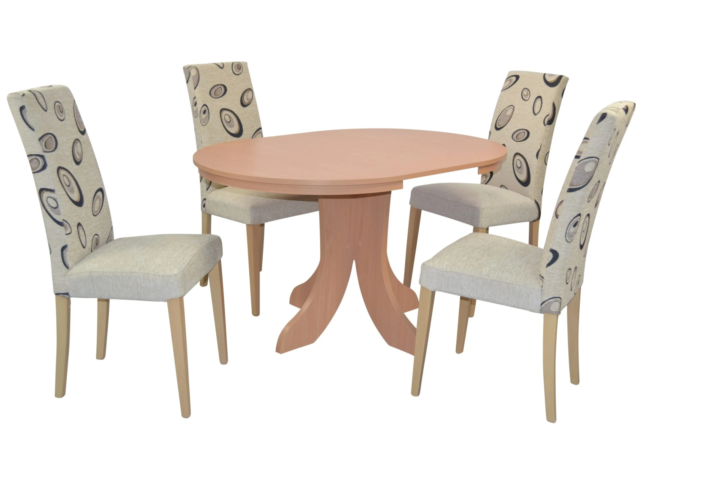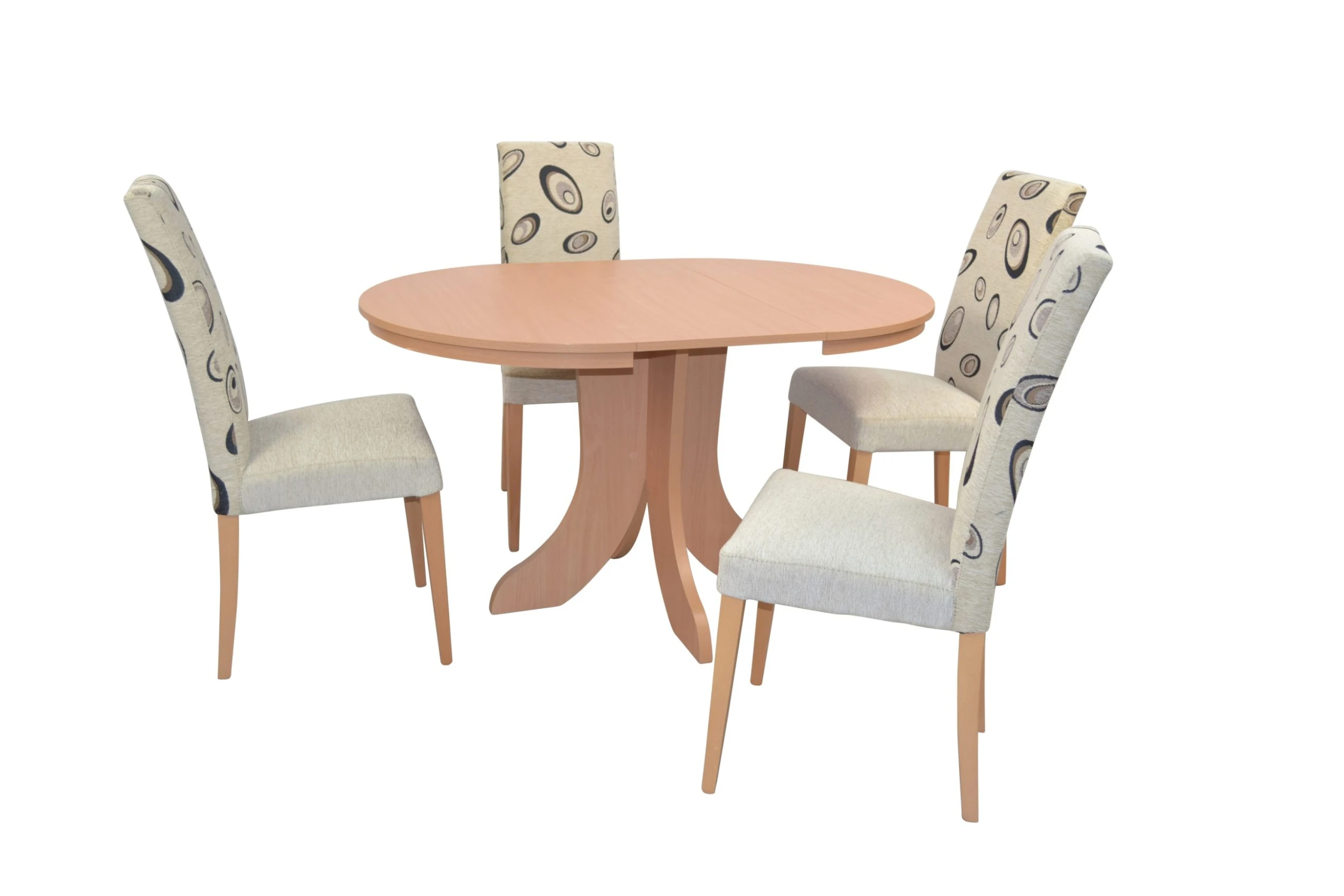 5tlg. Tischgruppe bestehend aus vier Polsterstühlen und einen runden Esstisch mit Auszugsfunktion. Die Beine der Stühle sind aus Massivholz Buche, buchefarben gebeizt und lackiert. Sitz und Rücken sind schaumstoffgepolstert und mit attraktiven Stoffbezug bezogen. Sitz unifarben, Rücken gemustert. Die Beine vom runden Esstisch und die ausziehbare Tischplatte sind aus Holzwerkstoff gefertigt und mit einem Melamin-Holzdekor, in Buche-Nachbildung, beschichtet. Die Platte lässt sich in der Mitte mit Metallaufschienen einfach auseinander ziehen, dazwischen lässt sich problemlos die ca. 40 cm Breite Einlegeplatte einlegen. Dadurch ist der Esstisch im handumdrehen von 90 cm bis auf 130 cm vergrößerbar. Stühle werden montiert angeliefert, Esstisch zur Selbstmontage, inklusive Aufbauanleitung. Maße ca. cm: (B/H/T) je Stuhl 46/100/57, Sitzhöhe ca. 50 cm, Sitztiefe ca. 37 cm. Esstisch (B/H/T) 90-130/76/90. Einlegeplatte muss separat aufbewahrt werden. Stoffzusammensetzungen: Stoffbezug TERRA (82% Polyester/18% VISKOSE) // Stoffbezug beige (33% Polyester/49% Polyacryl/18% Viskose) // Stoffbezug braun (54% Polyester/46% Polyacryl)
