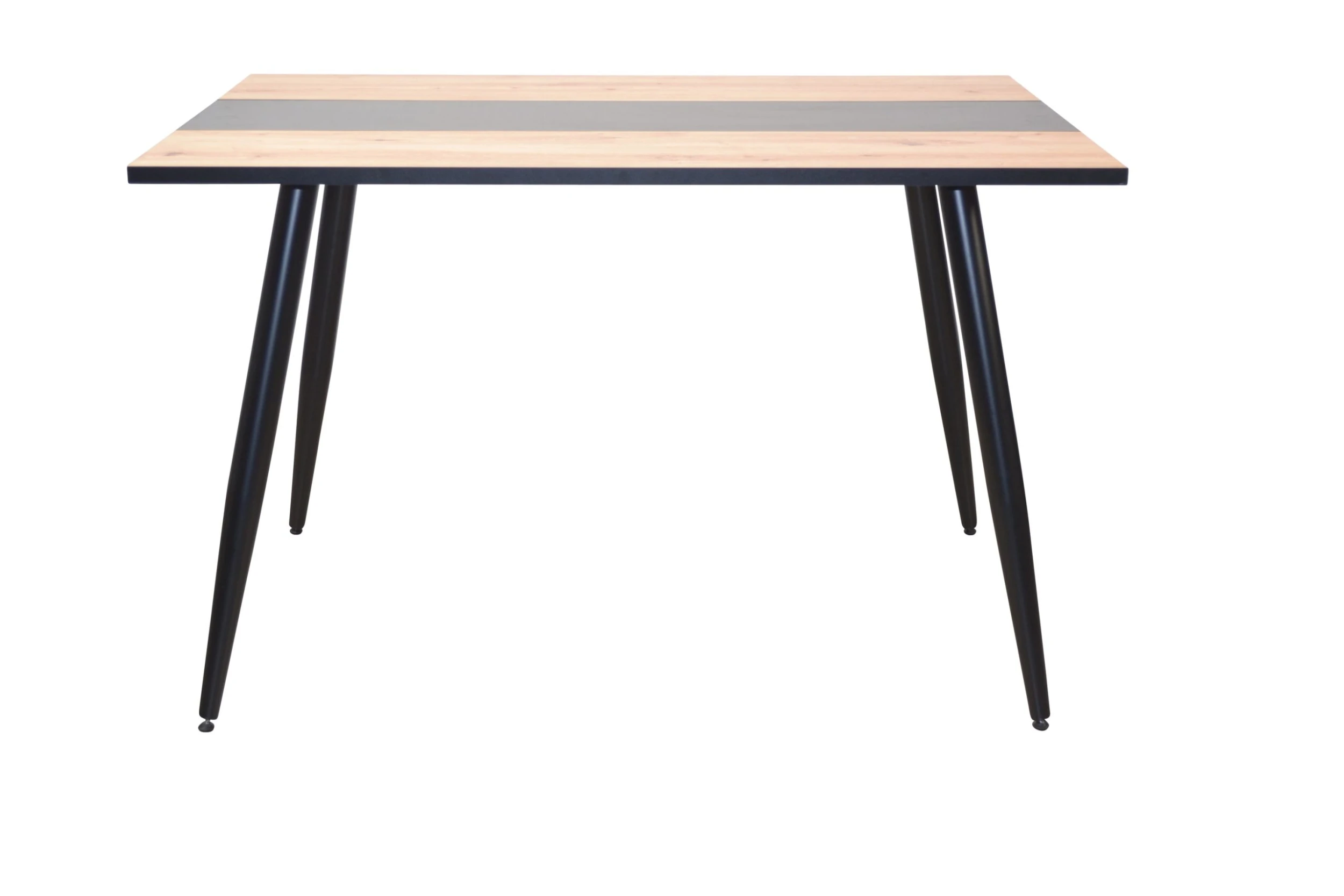 Moderne 5tlg.-Tischgruppe bestehend aus einen großen Esstisch und vier Stühlen. Moderner Esstisch mit 4 Stahlrohrbeinen, schwarz pulverbeschichtet. Tischplatte 120×80 cm mit einer Mittelplatte, uni schwarz beschichtet, rechts/links jeweils eine Platte, die mit einem Melmainholzdekor in Artisan-Eiche-Nachbildung, beschichtet ist. Tischplatte aus Holzwerkstoff (Spanplatte). Kanten der Tischplatte schwarz belegt.