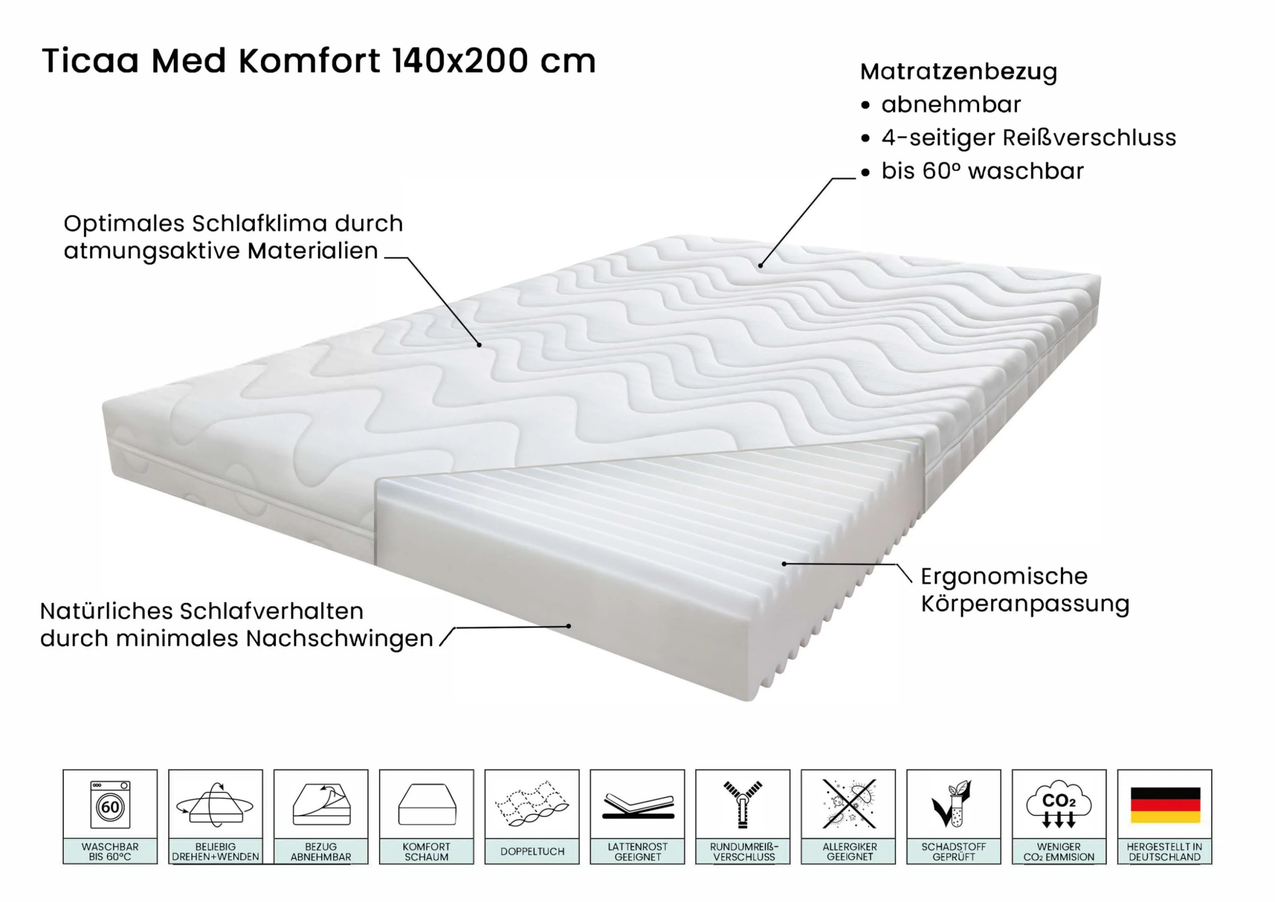 Diese Matratze bietet eine ergonomische Körperanpassung, die höchsten Schlafkomfort gewährleistet. Die Matratze ermöglicht ein natürliches Schlafverhalten durch minimales Nachschwingen und eignet sich somit für jede Schlaflage. Der Bezug kann leicht abgenommen und bei bis zu 60 Grad gewaschen werden. Sie ist für Menschen mit Rücken- und Bandscheibenproblemen geeignet.