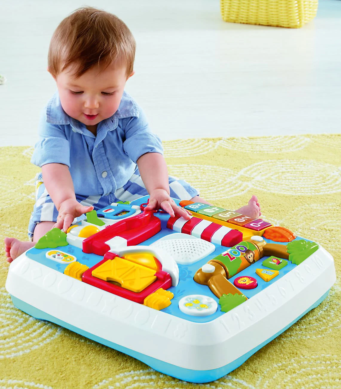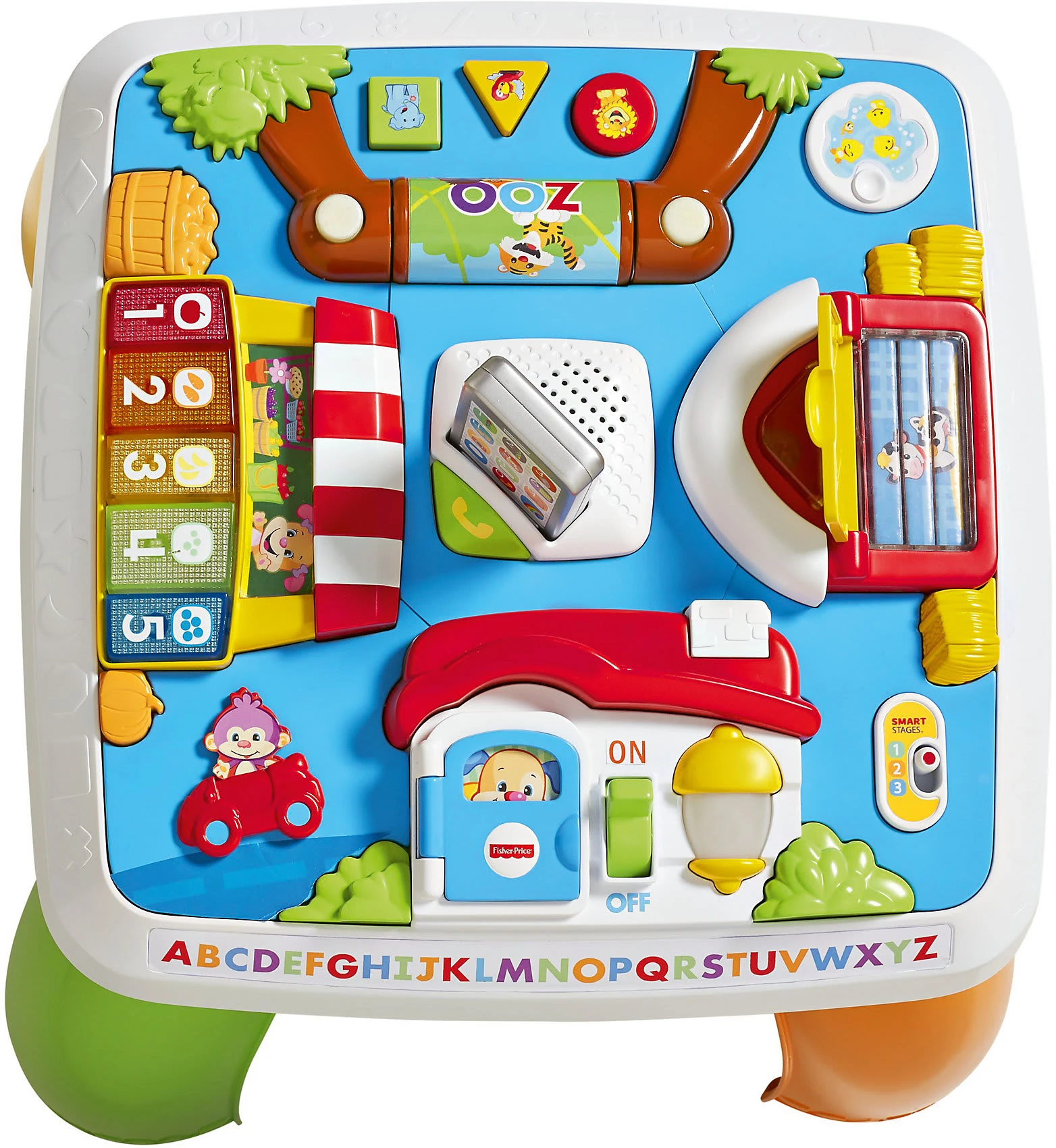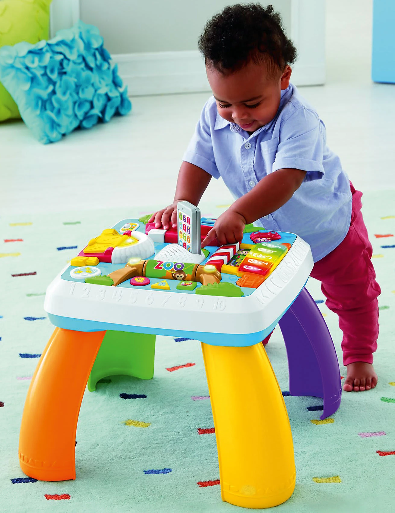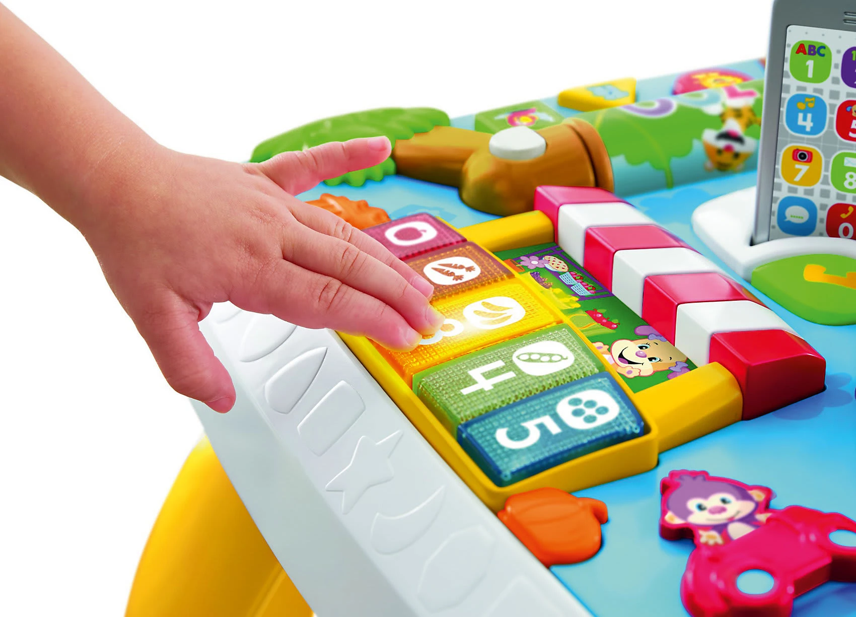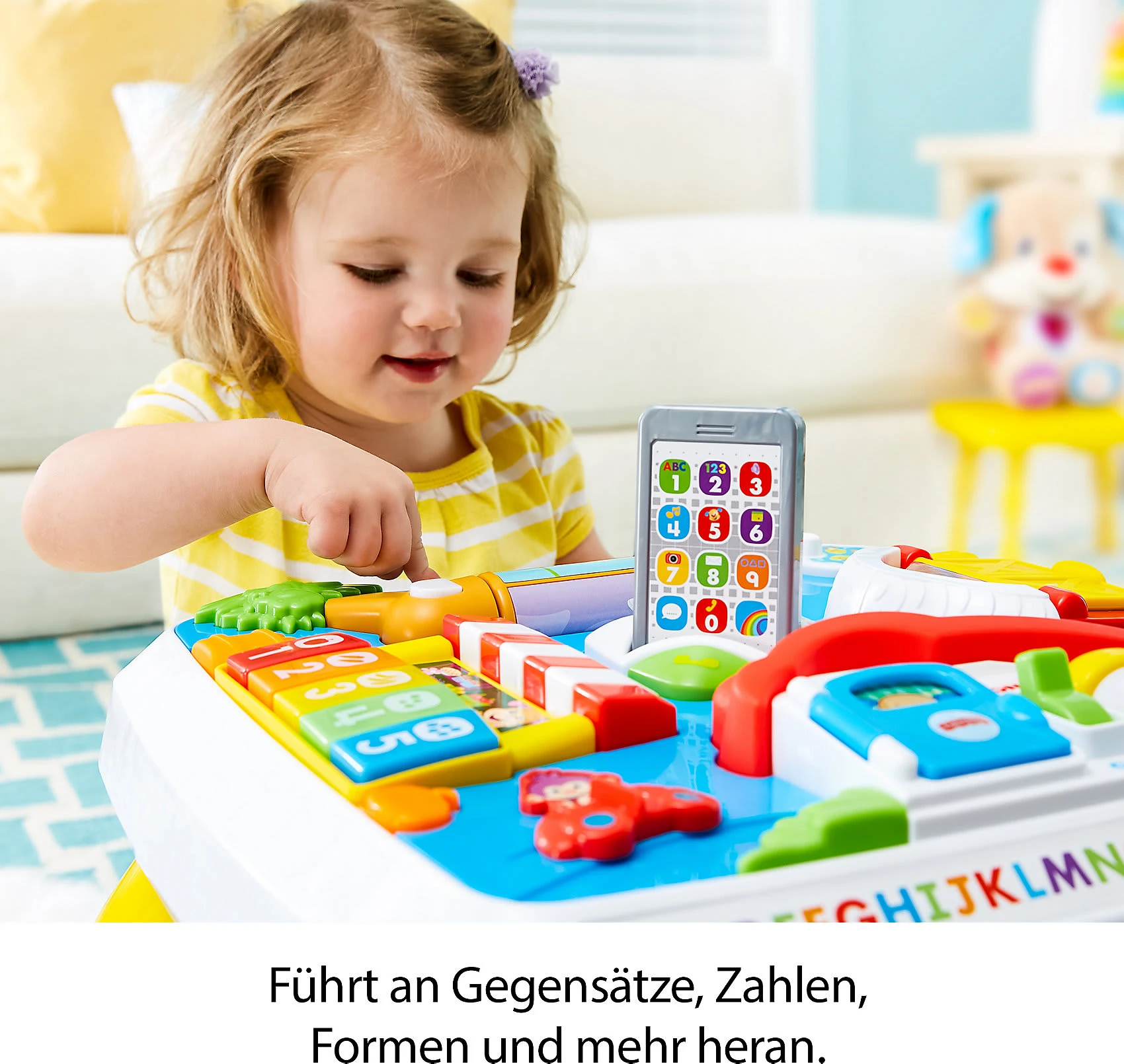 So macht lernen Spaß! Der Lernspaß Spieltisch von Mattel verfügt über fünf vertraute Bereiche zum Entdecken und zur Förderung der Fein- und Grobmotorik: Hündchens Zuhause, der Markt, der Zoo, der Bauernhof und ein interaktiver Telefonknopf. Mit einem mobilen Rollenspiel-Telefon, 9 Lichtern und mehr als 120 Liedern, Melodien und Sätzen sorgt der Tisch für jede Menge Abwechslung.