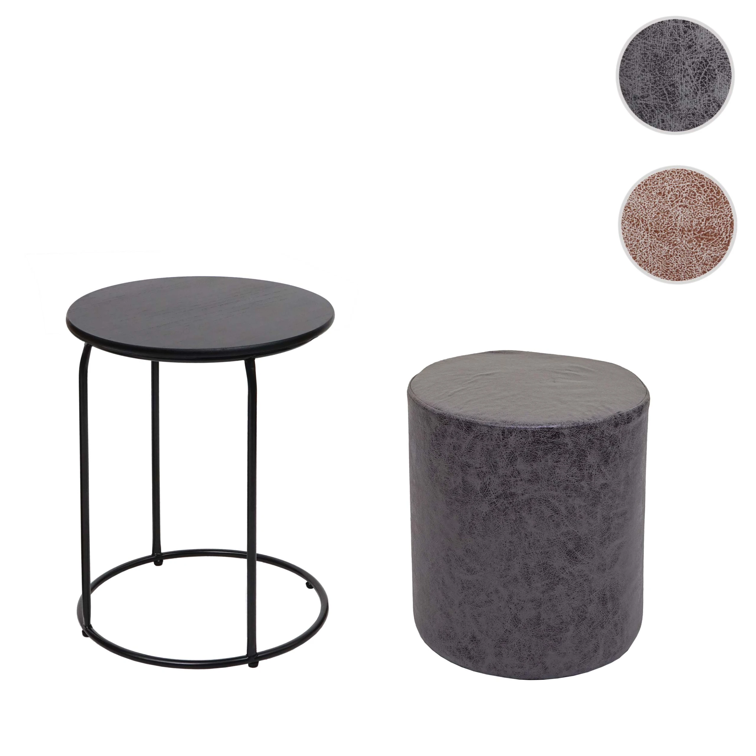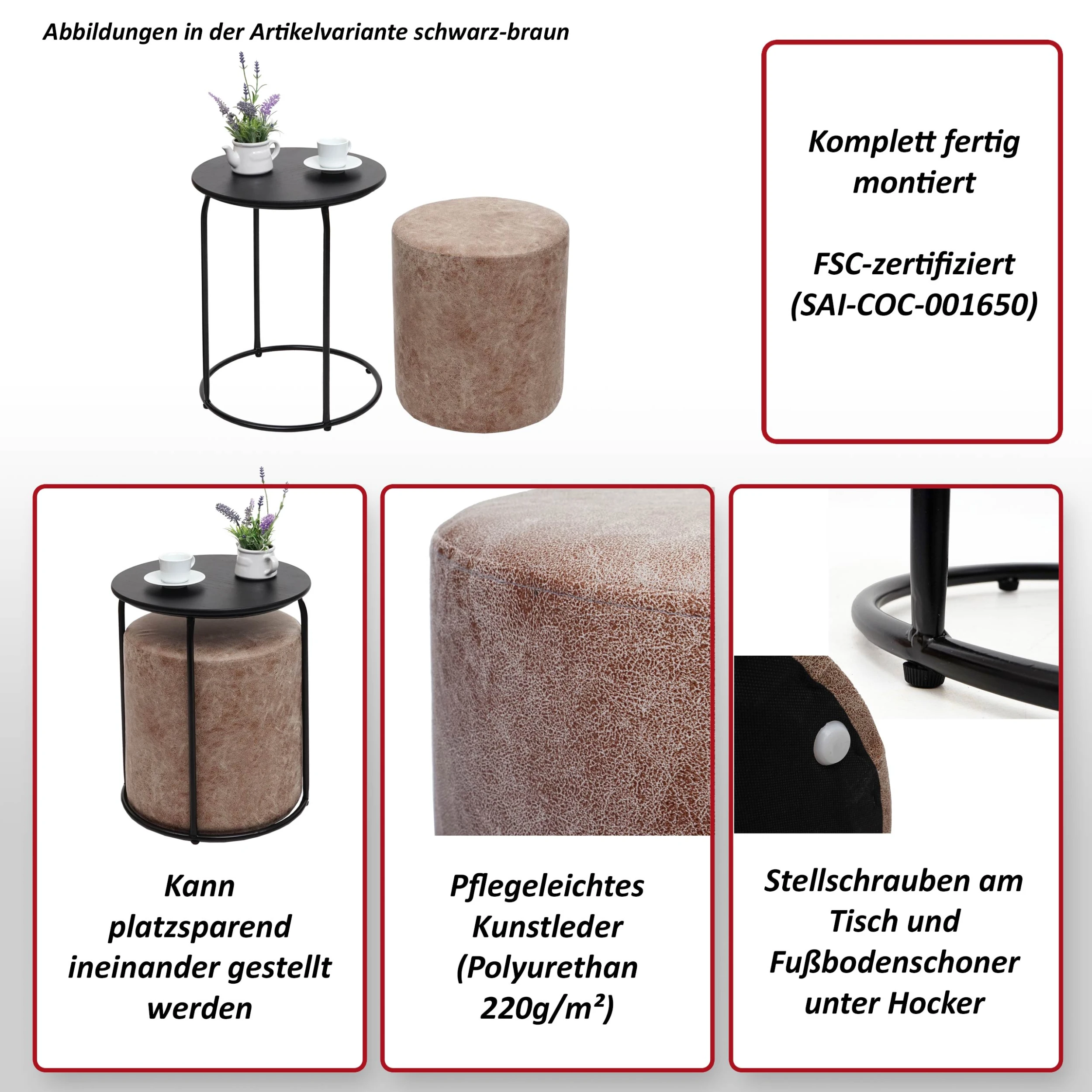 – Der Beistelltisch mit Eisengestell und MDF-Tischplatte bietet Platz für Getränke, Snacks oder Kleinigkeiten. Der Pouf mit pflegeleichtem Kunstleder ist eine bequeme Sitzmöglichkeit oder ein Fußhocker und kann platzsparend unter dem Tisch verstaut werden.