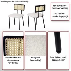 – Dieser Wohnzimmerstuhl zeichnet sich durch seinen schicken Retro-Look aus und ist in jedem Raum ein echter Hingucker. Die Materialkombination aus Geflecht und dem Bouclé Bezug runden die Optik des Polsterstuhls bestens ab und lassen ihn edel aussehen.