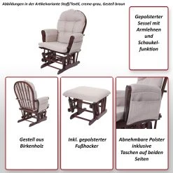 Bei diesem Produkt handelt es sich um einen ganz besonderen Schaukelstuhl: Durch die dicke Polsterung äußerst bequem, mit Schaukelfunktion bei Sessel und Hocker – da bleiben keine Wünsche offen. Sitz- und Rückenkissen sind durch Schnüre und Klettverschluss angebracht und somit auch abnehmbar. Auf beiden Seiten des TV-Sessles sind Taschen angebracht. Diese bieten ausreichend Platz für beispielsweise Bücher oder Zeitschriften. Ihn anzuschauen fühlt sich dadurch mindestens so gut an, wie darin zu sitzen oder zu liegen.