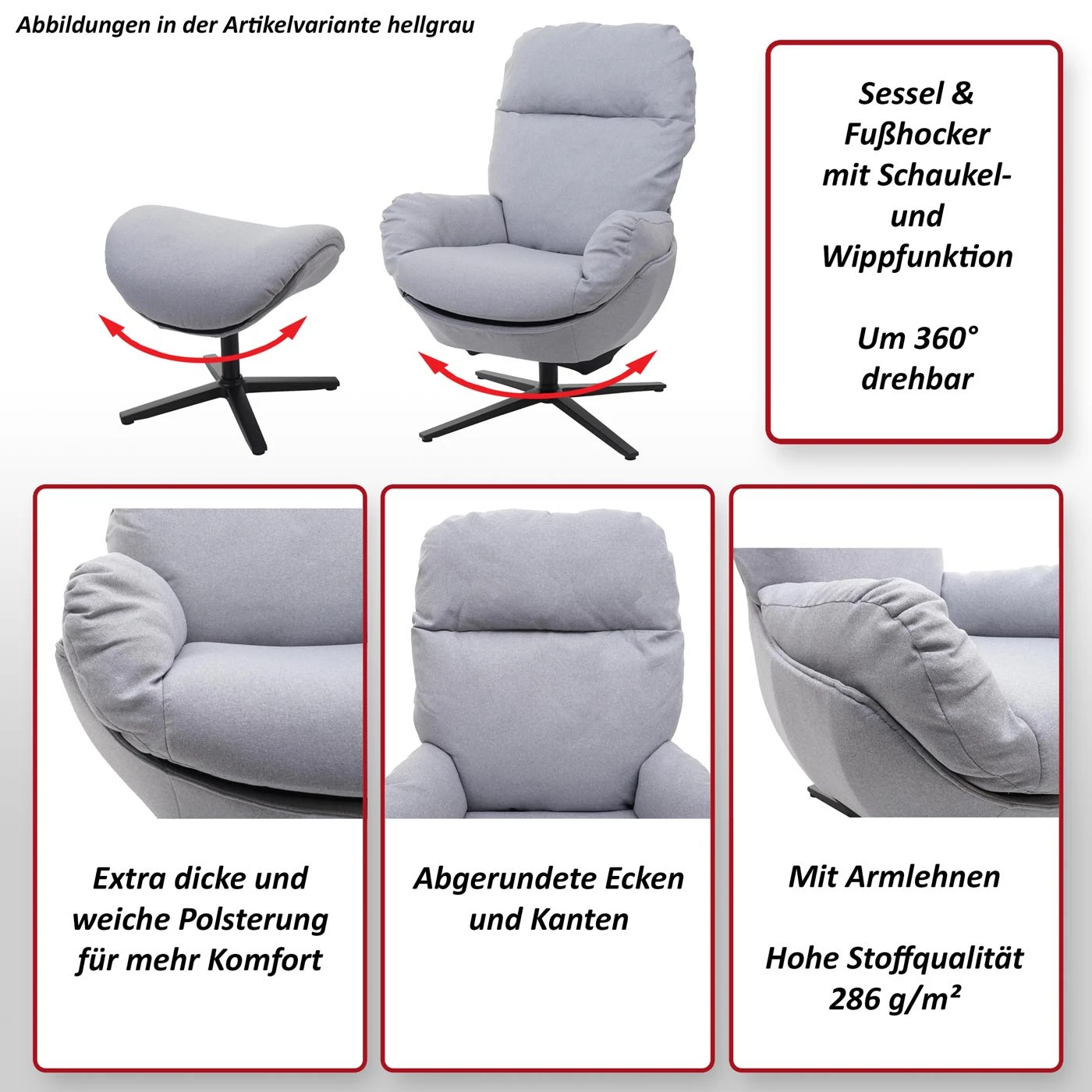 – Dieser tolle Lounge-Sessel ist drehbar und hat auch eine Schaukelfunktion. In Kombination mit der Fußablage, die sich beliebig nach Ihren Bedürfnissen verschieben lässt, ist er ideal für eine gemütliche Zeit vor dem Fernseher oder mit einem guten Buch.