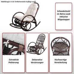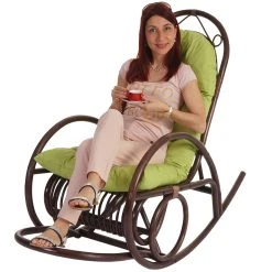 Die wunderschön verschnörkelten Armlehnen unterstreichen den Retro-Look, den Schaukelstühle generell verbreiten, und macht dieses Produkt zu einem immer modernen Klassiker. Für langanhaltende Freude sorgt das stabile Holzgestell mit schönem Rattangeflecht, das den Bezugsstoff farblich bestens ergänzt. Dazu kommt noch die hochwertige und bequeme Textilauflage die zu stundenlangem Verweilen einlädt.