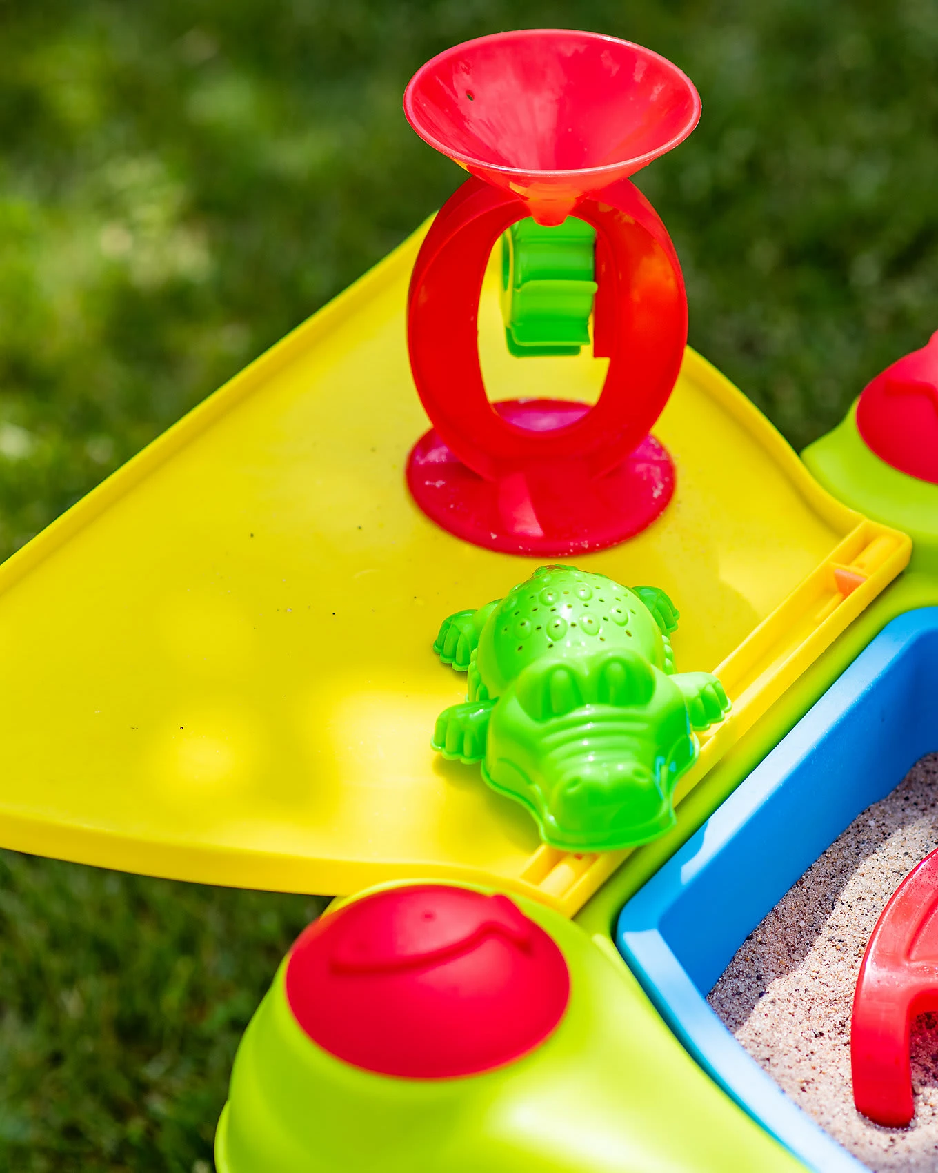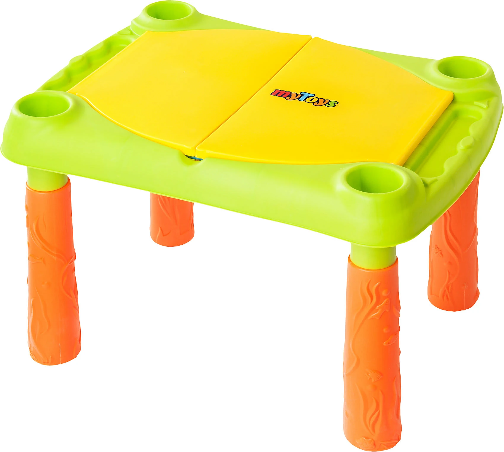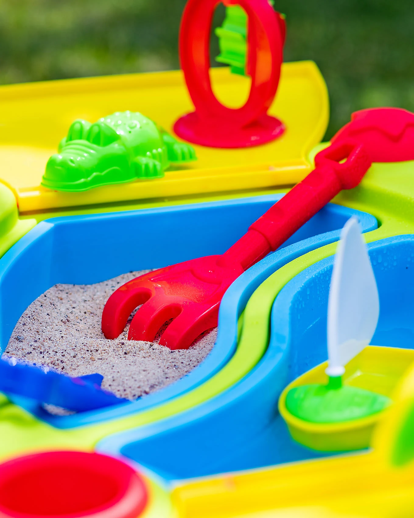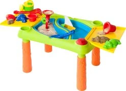Bequemes Planschen, Buddeln und Formen mit dem Sand- und Wasserspieltisch“ von myToys! Der Tisch bringt 10 Zubehörteile für viel Spielspaß mit. Hier darf nach Herzenslust gespielt und geplantscht werden. Der farbenfroh gestaltete Spielplatz kann beidseitig aufgeklappt werden und begeistert im Inneren mit vielen Möglichkeiten für kleine Entdecker*innen. Hier ist ein Wasserbassin, in dem das kleine Boot fahren kann, und Spielfächer zum Befüllen mit Sand. Die beiden Fächer lassen sich, bei Bedarf, zum Reinigen herausnehmen. Förmchen, Schaufel und Gießkanne bieten allerhand Spielespaß und die Möglichkeit gleichzeitig mit Sand und Wasser zu spielen fördert die Kreativität und sorgt für haptische Erlebnisse.