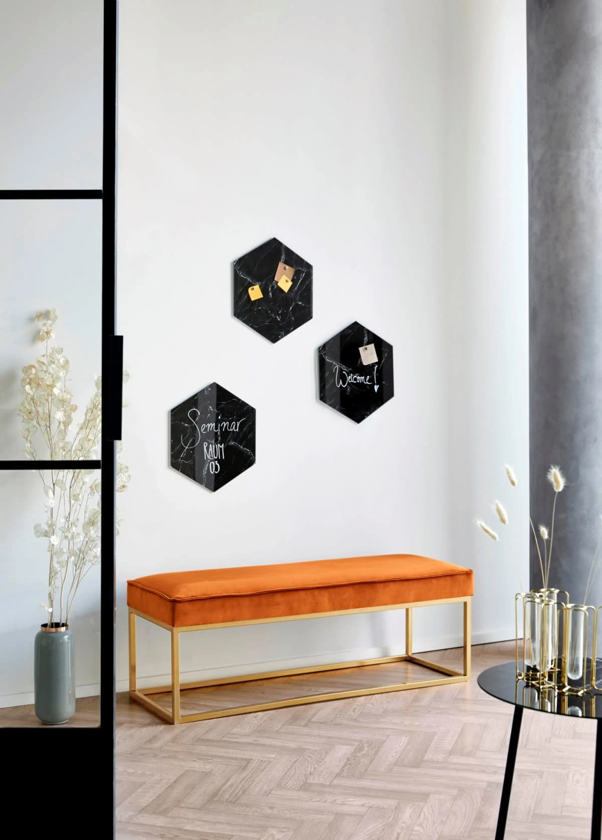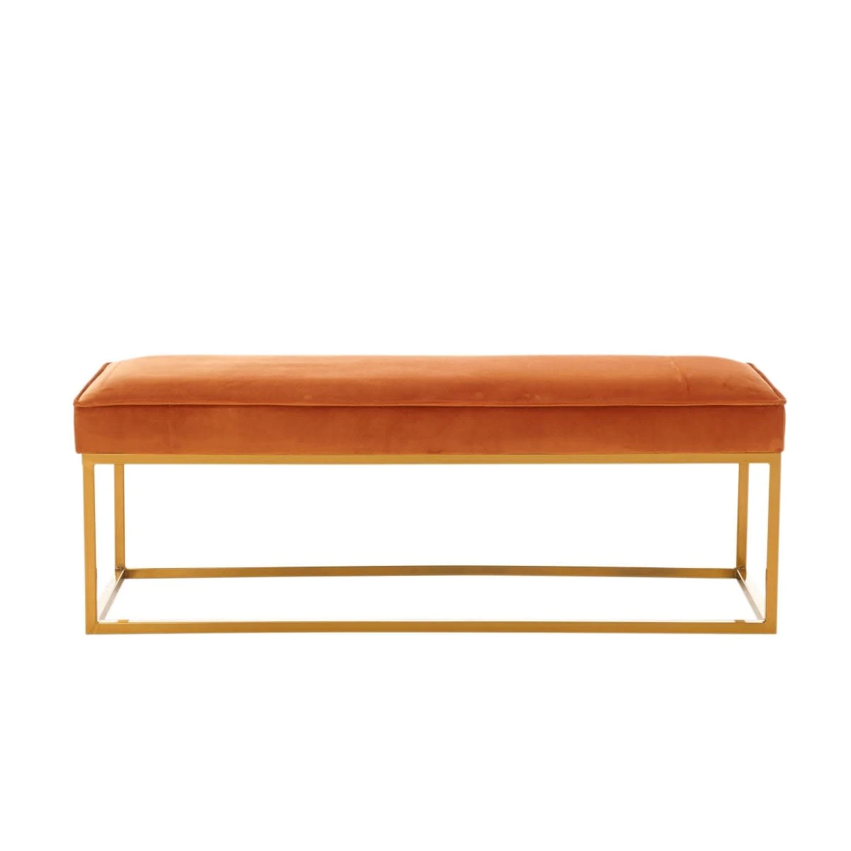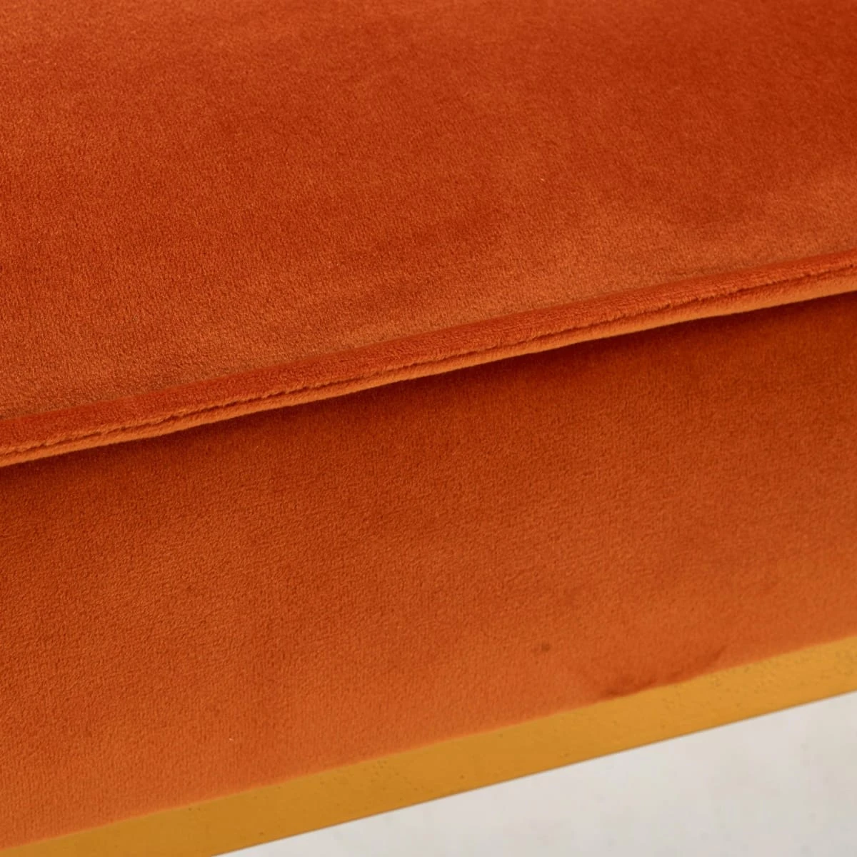 Elegante Sitzbank mit goldfarbenen Metallfüßen.