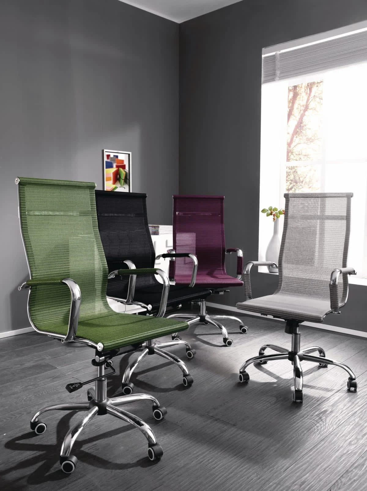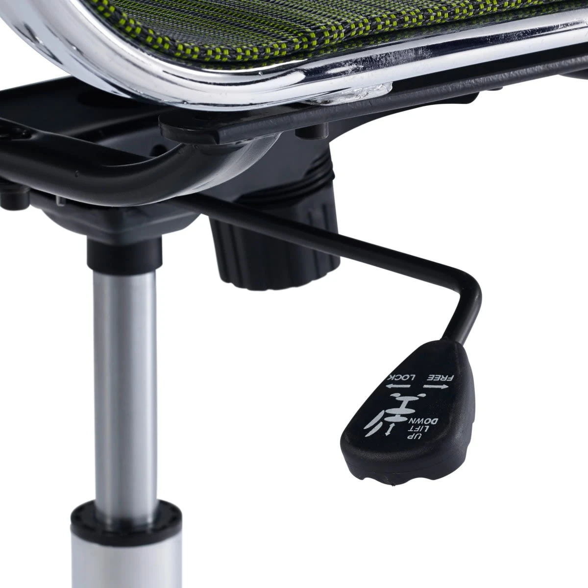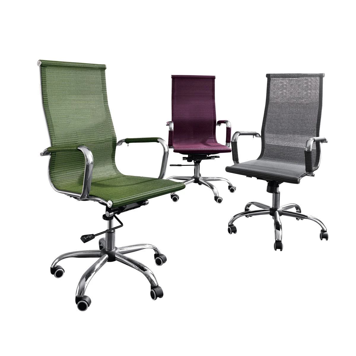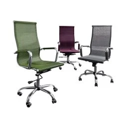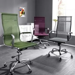 Moderner Bürostuhl mit luftigem Netzbezug und verchromten Metallelementen. Stufenlose Sitzhöhenverstellung von 45-56 cm, Wippfunktion mit Widerstandsregulierung und Hartbodenrollen. Lieferung erfolgt zerlegt mit Aufbauanleitung. Material: Kunststoff, Metall. Maße: ca. B63 x T56 x H118 cm.