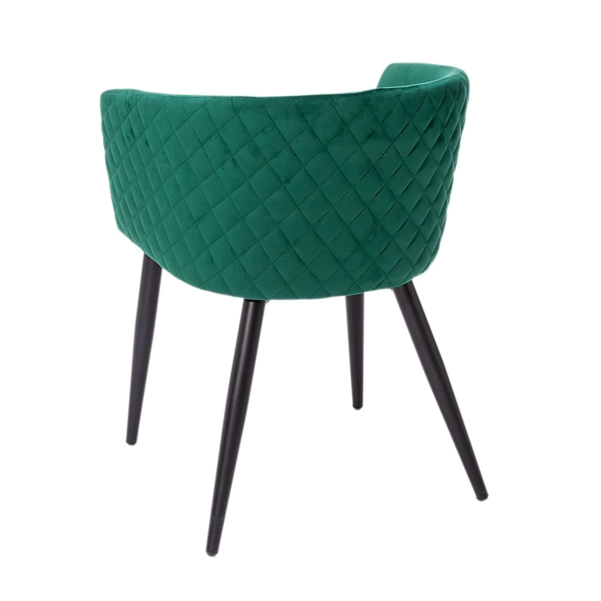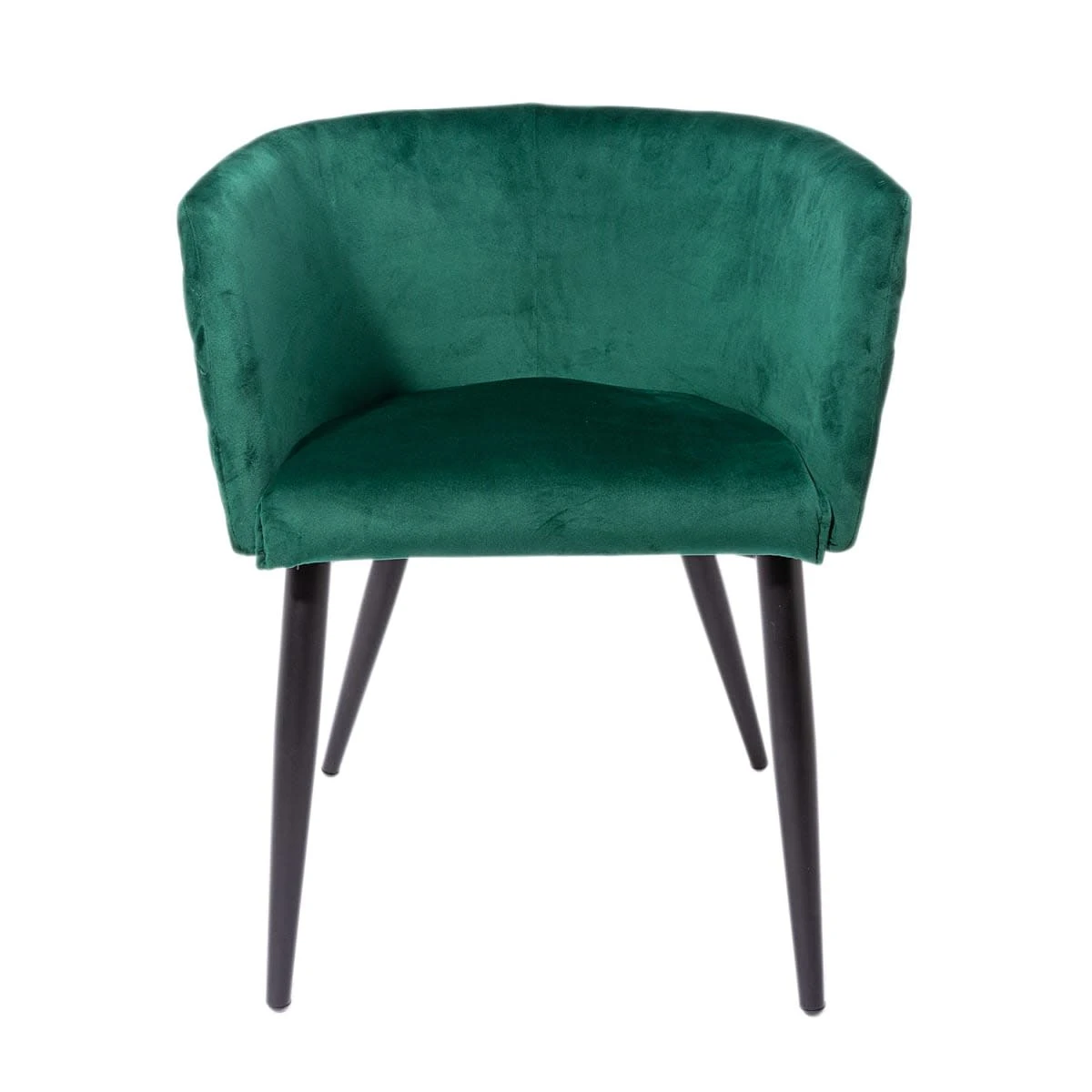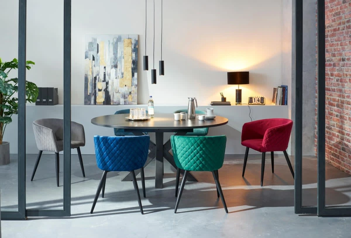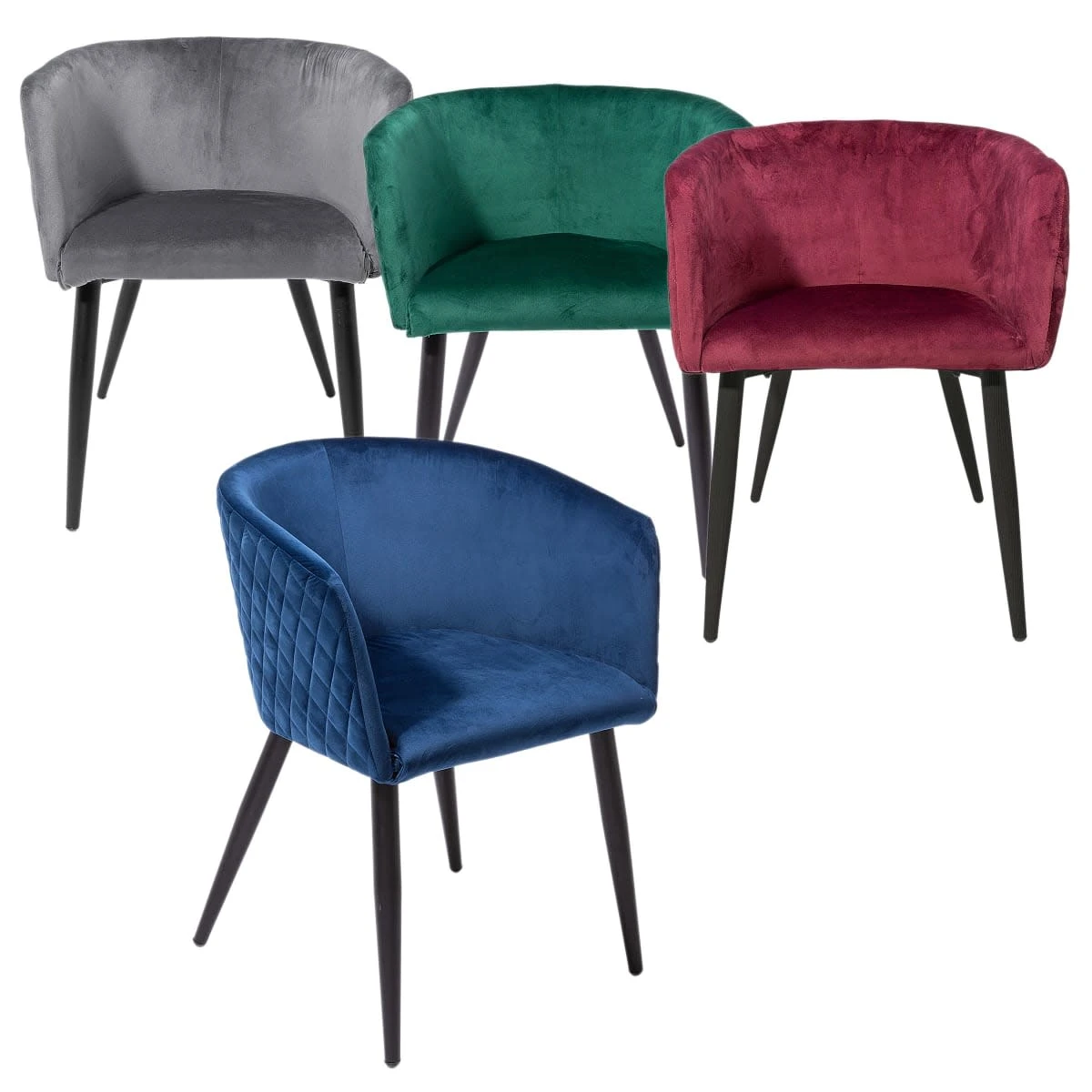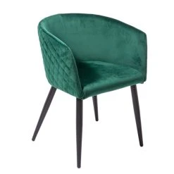 Samtstuhl mit matt schwarzen Metallbeinen und gepolsterter Sitzfläche.