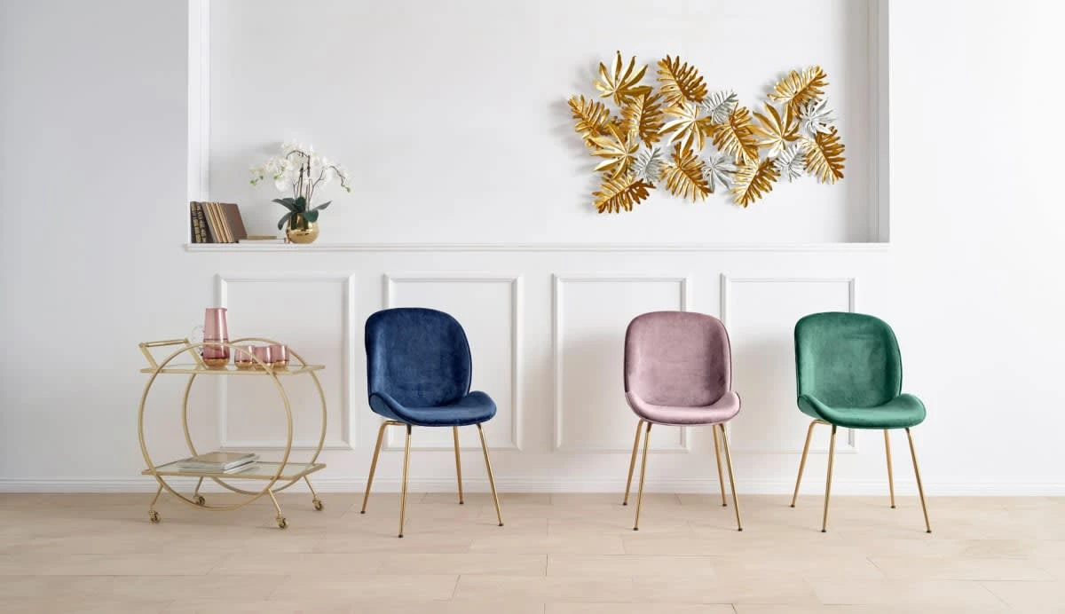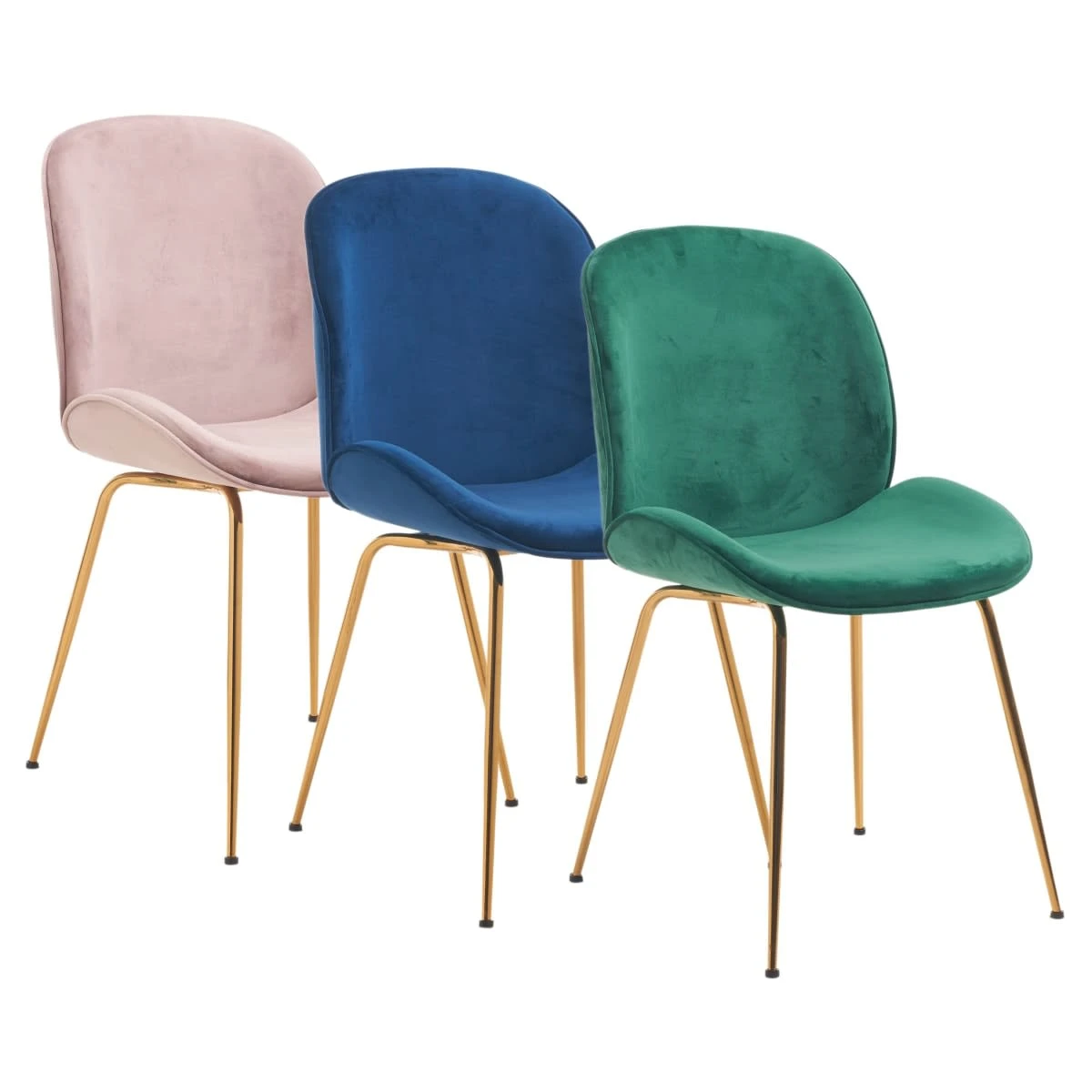 Samtstuhl mit glänzenden Beinen und gepolsterter Sitzfläche.