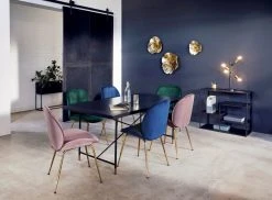 – Eleganter Stuhl mit gepolsterter Sitzschale mit Samtbezug und goldfarbenen Beinen aus Metall