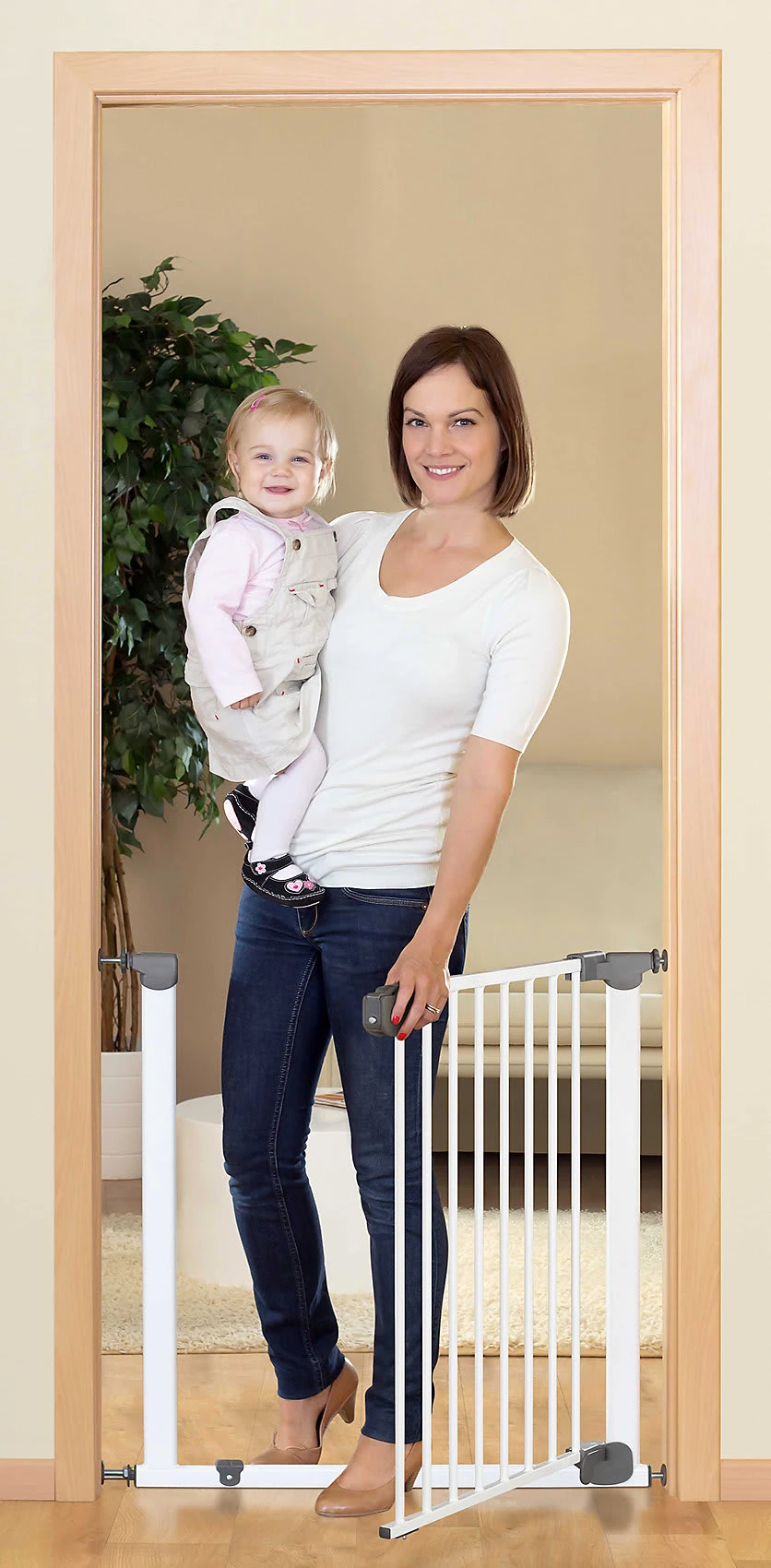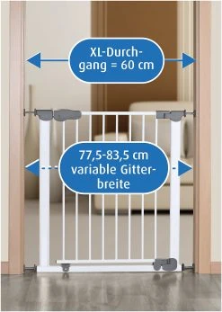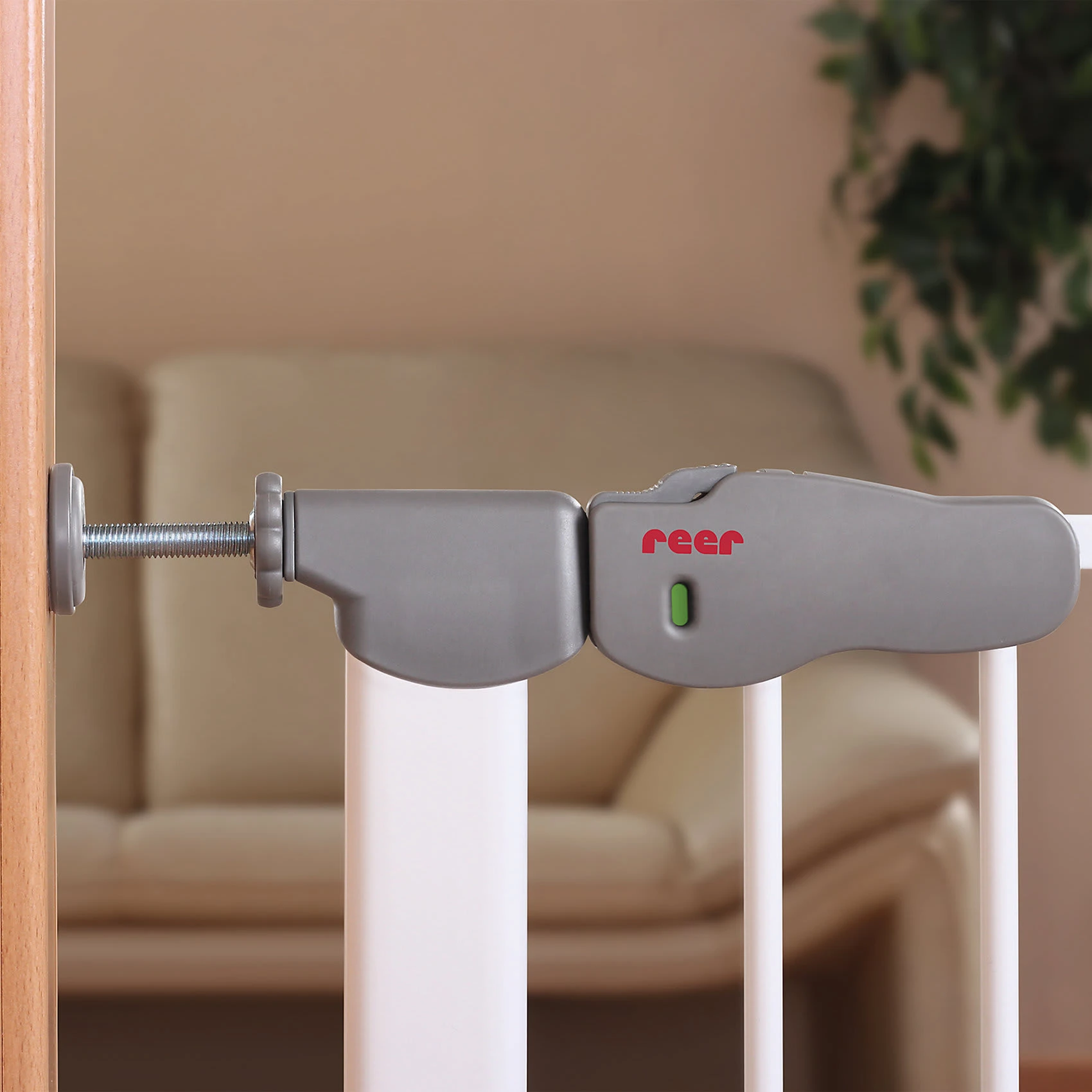 Das Klemmgitter I-Gate mit automatischem Verschlusssystem Auto-Close von Reer zeichnet sich durch seine leichte Montage ohne Bohren und Schrauben aus. Die Gitterbreite ist dabe variabel einstellbar von 77,5 – 83,5 cm. Mithilfe von max. 4 Verlängerungseinheiten ist das I-Gate auf 111,5 cm erweiterbar. Die Höhe beträgt 77 cm.