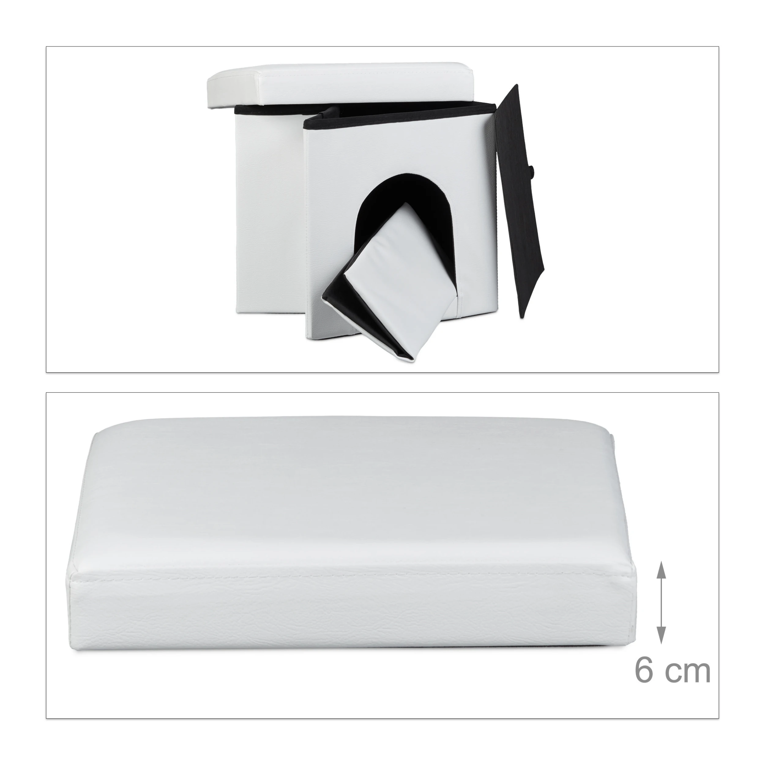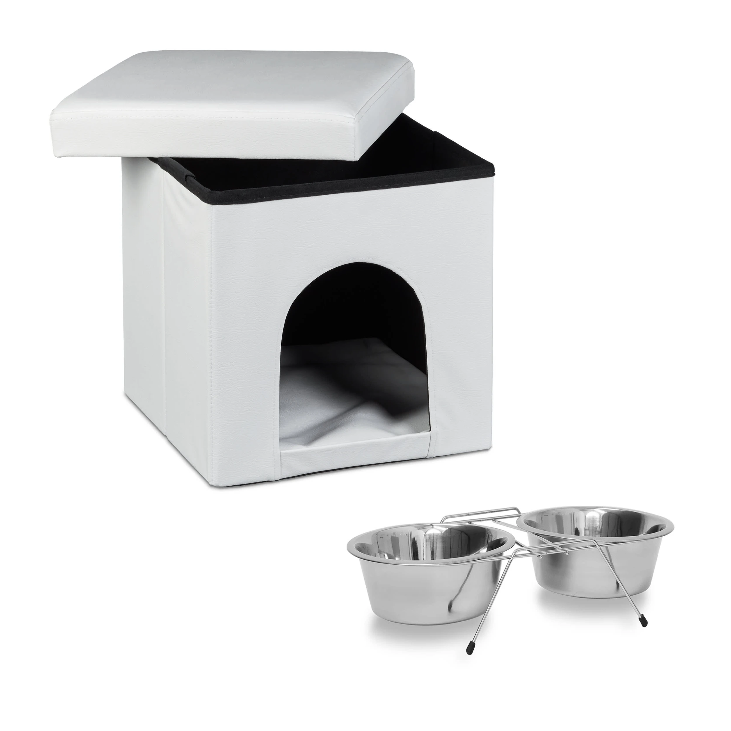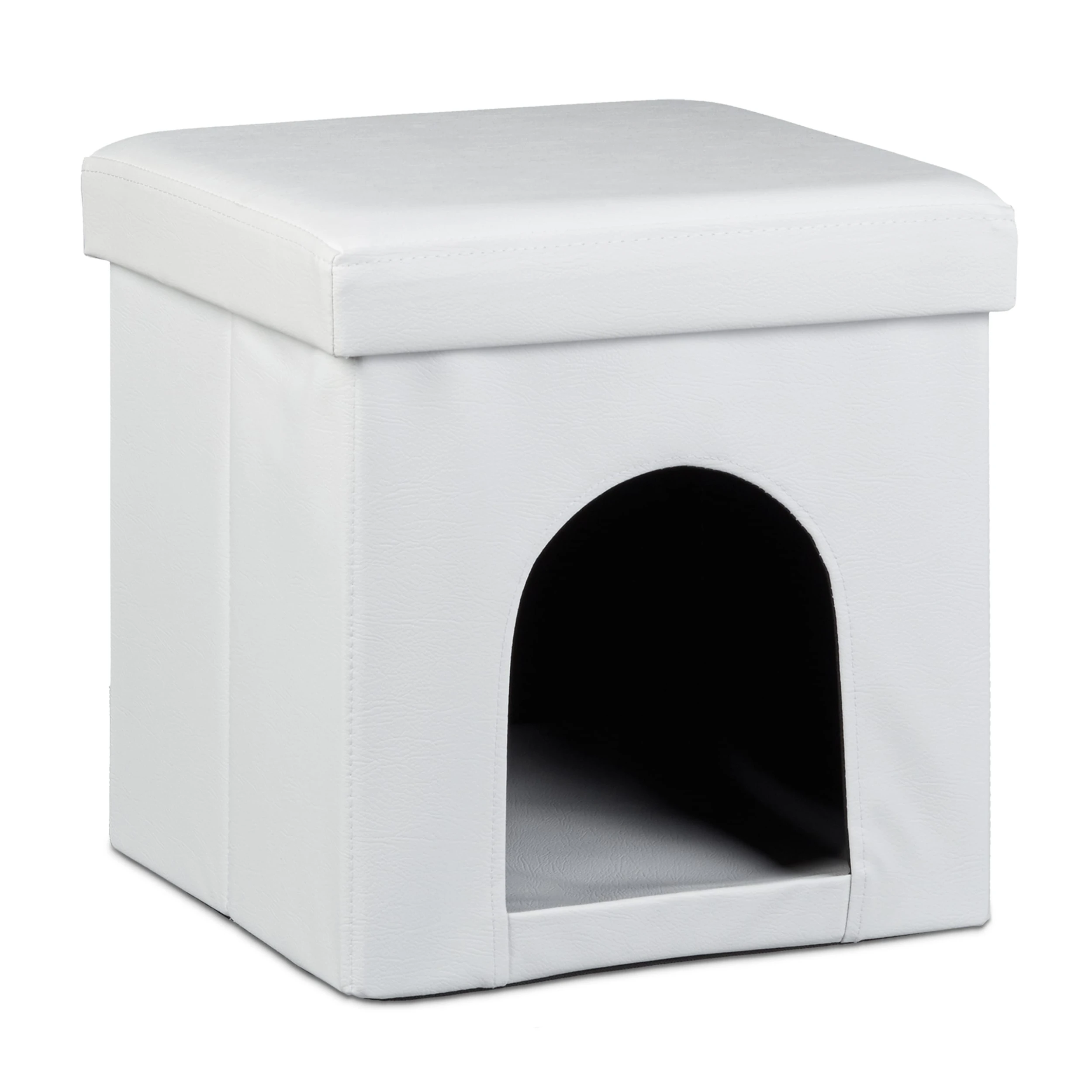 Dieses Set eignet sich ideal, um Ihrem Vierbeiner eine gemütliche Rückzugsmöglichkeit zu schaffen. Ihr Haustier wird sich im Inneren dieses Sitzwürfels wohl fühlen. Eine geräumige Luke bildet den Zugang zum großzügigen Stauraum. Auch größere Hunde und Katzen finden hier Platz. Das Kunstleder lässt den Sitzhocker in Ihrem Wohnzimmer zudem schick aussehen. Und wenn Sie spontan Platz benötigen, können Sie die Hundehütte mit wenigen Handgriffen zusammenfalten und verstauen.