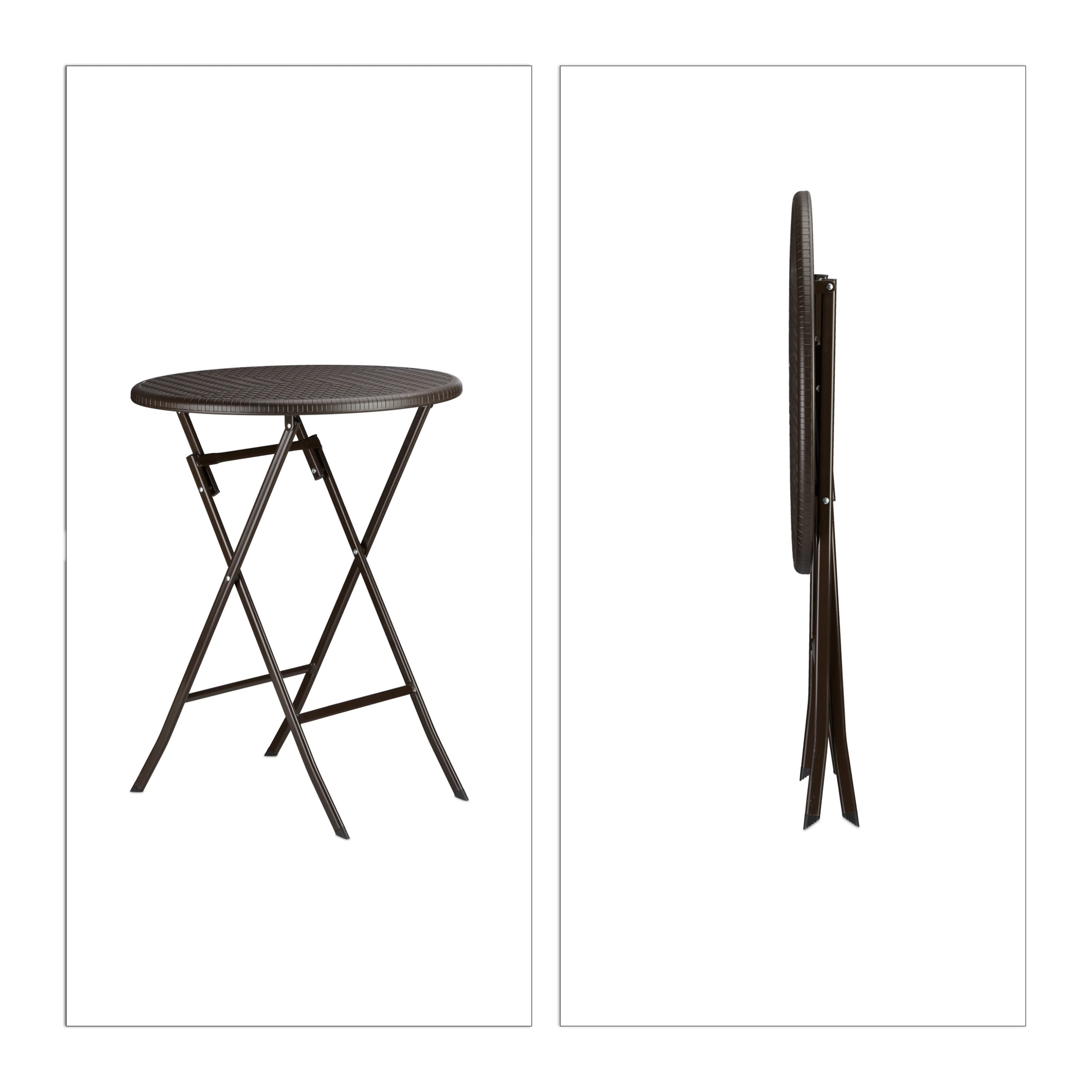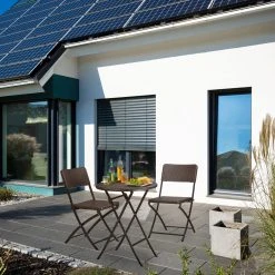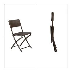 Das Gartenmöbel Set BASTIAN trumpft mit seiner Funktionalität und schicken Rattan-Optik. Sowohl der Tisch als auch die beiden Stühle können zusammengeklappt und ohne großen Platzaufwand verstaut werden. Die kleine Sitzgruppe besteht aus witterungsbeständigem Kunststoff und eignet sich prima für den Balkon, den Garten oder die Terrasse. Alternativ können Sie die Möbel auch in die Wohnung stellen. Die Gummifüßchen sorgen für einen sicheren Stand und schonen Ihre Fußböden.