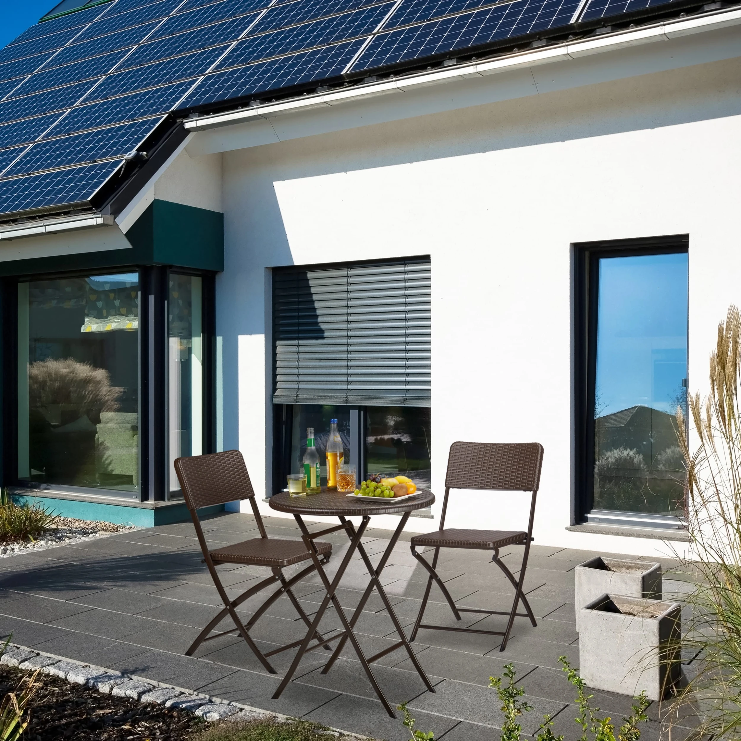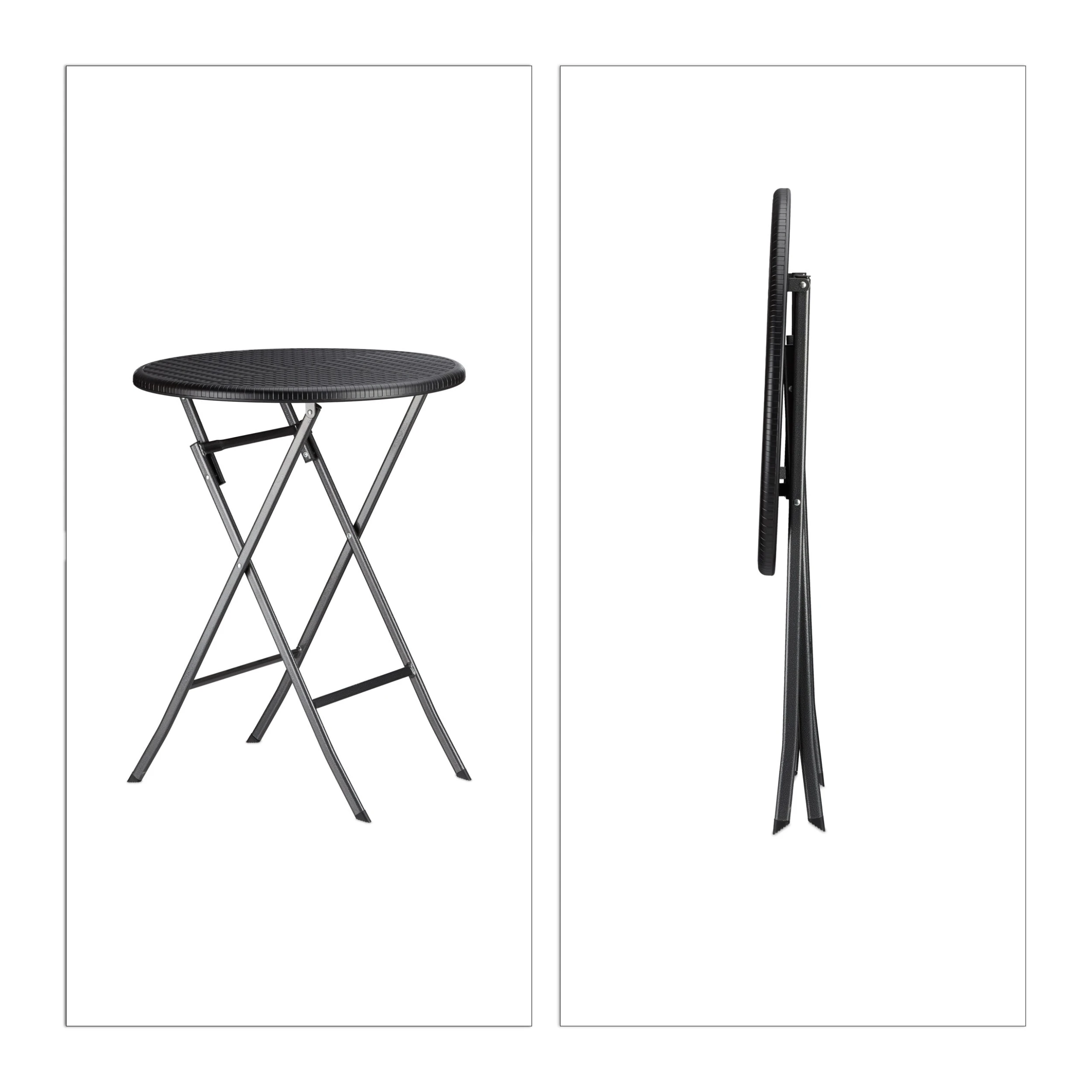 Das Gartenmöbel Set BASTIAN trumpft mit seiner Funktionalität und schicken Rattan-Optik. Sowohl der Tisch als auch die beiden Stühle können zusammengeklappt und ohne großen Platzaufwand verstaut werden. Die kleine Sitzgruppe besteht aus witterungsbeständigem Kunststoff und eignet sich prima für den Balkon, den Garten oder die Terrasse. Alternativ können Sie die Möbel auch in die Wohnung stellen. Die Gummifüßchen sorgen für einen sicheren Stand und schonen Ihre Fußböden.