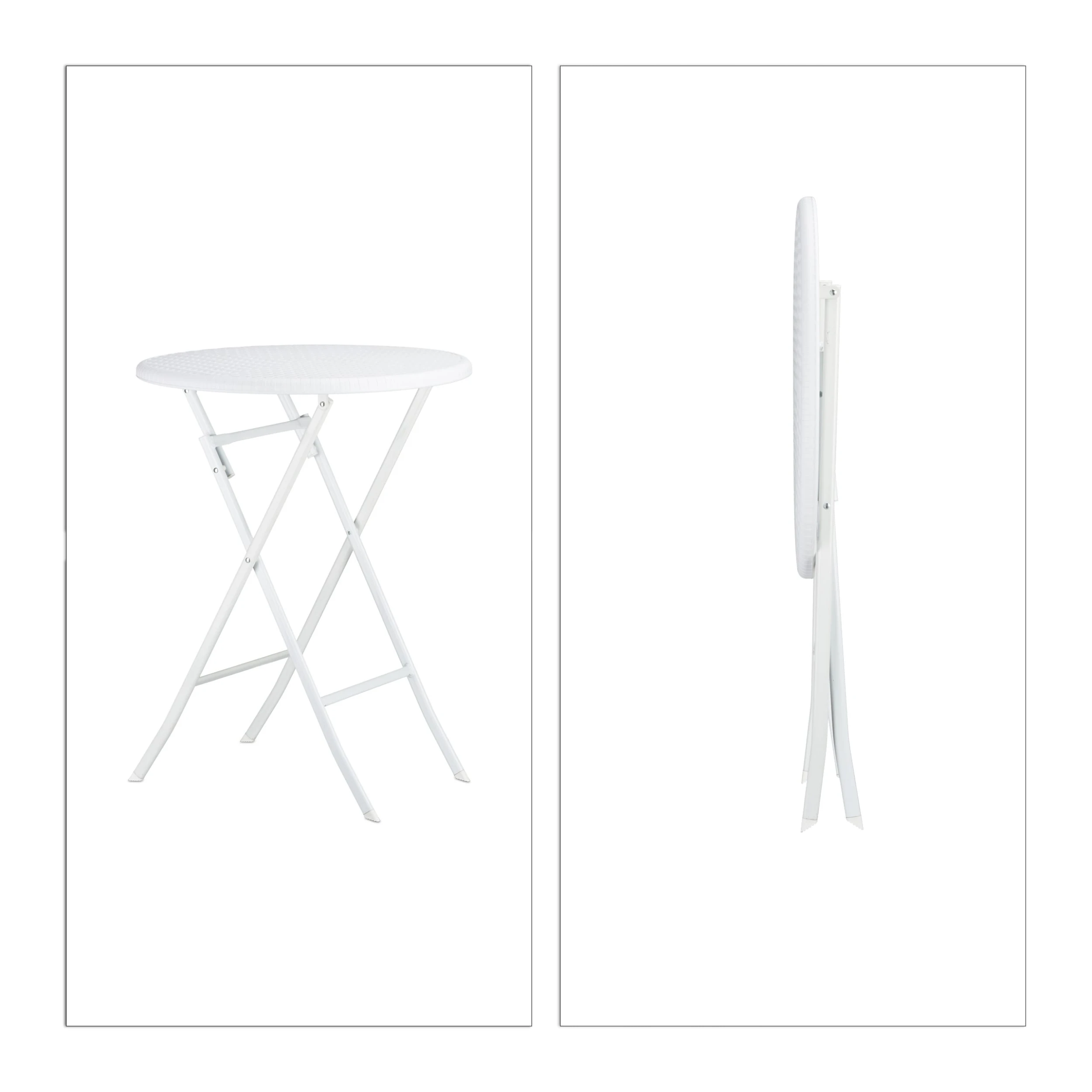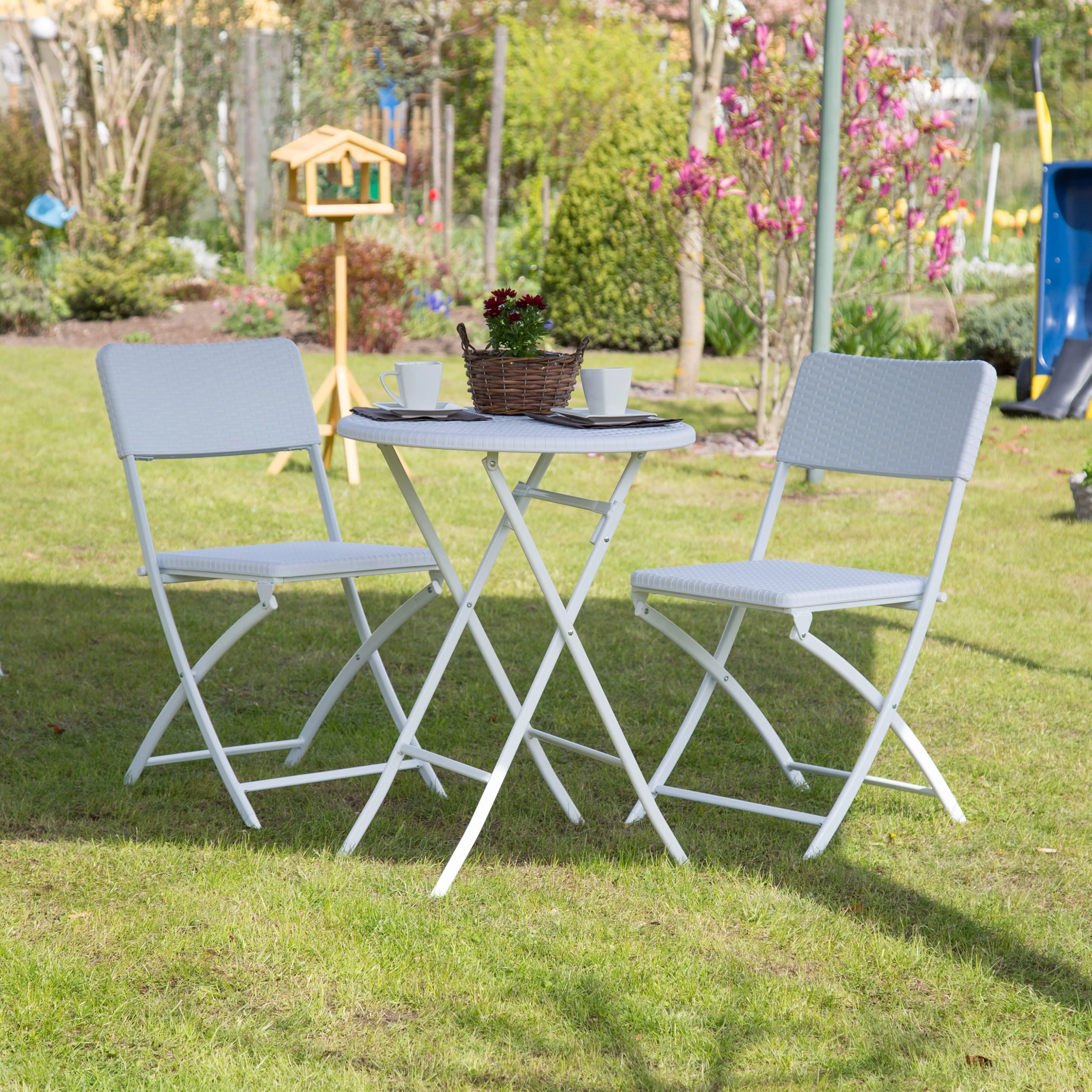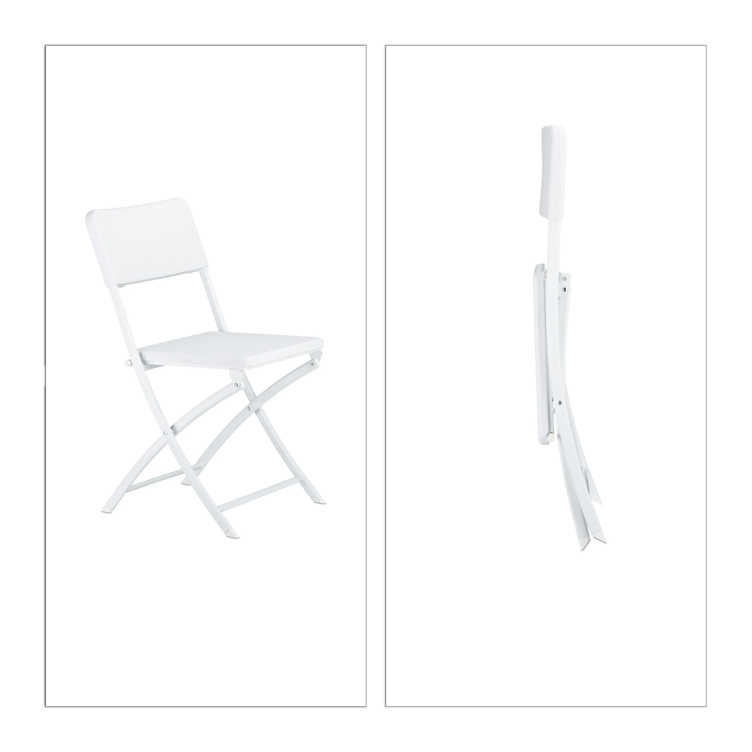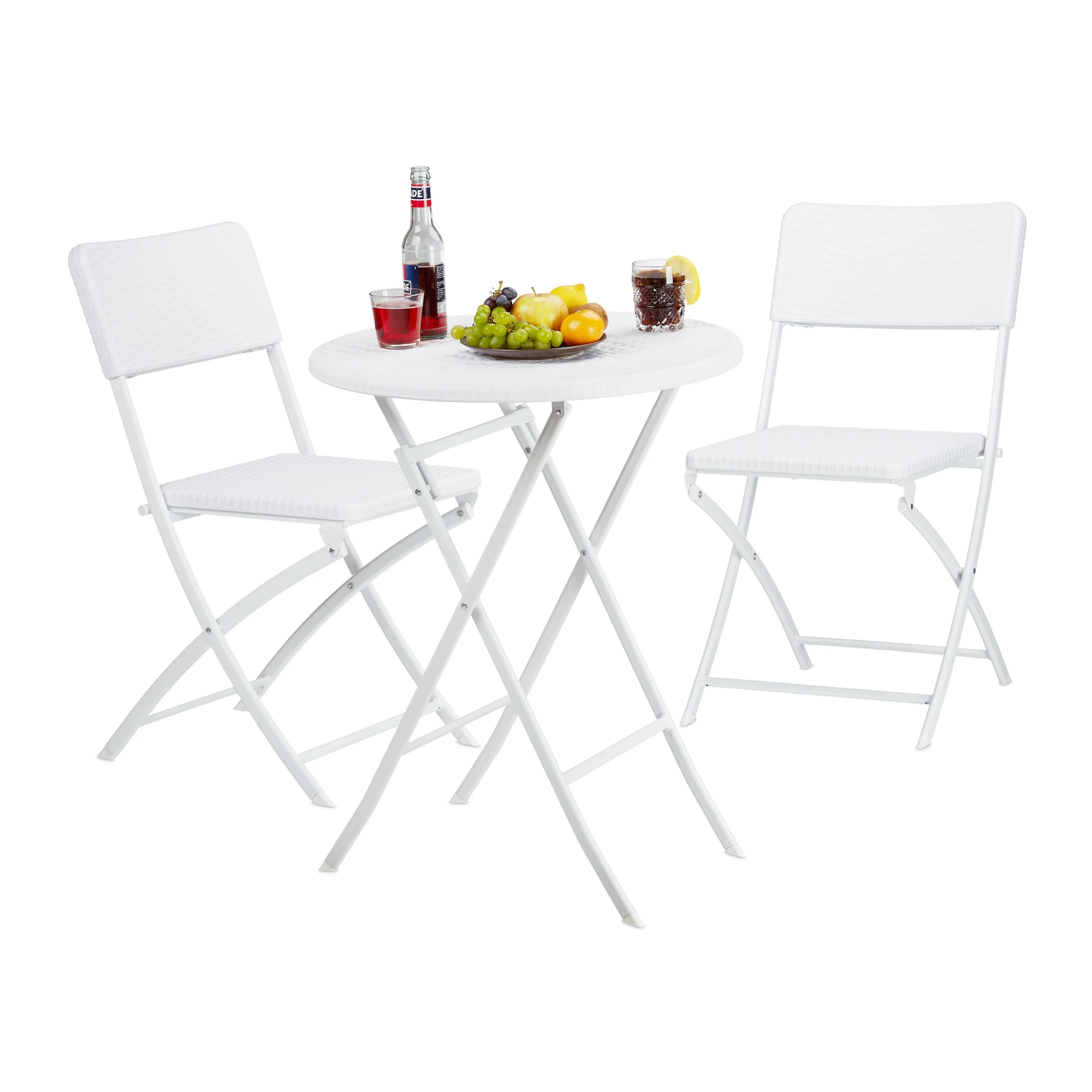 Das Gartenmöbel Set BASTIAN trumpft mit seiner Funktionalität und schicken Rattan-Optik. Sowohl der Tisch als auch die beiden Stühle können zusammengeklappt und ohne großen Platzaufwand verstaut werden. Die kleine Sitzgruppe besteht aus witterungsbeständigem Kunststoff und eignet sich prima für den Balkon, den Garten oder die Terrasse. Alternativ können Sie die Möbel auch in die Wohnung stellen. Die Gummifüßchen sorgen für einen sicheren Stand und schonen Ihre Fußböden.